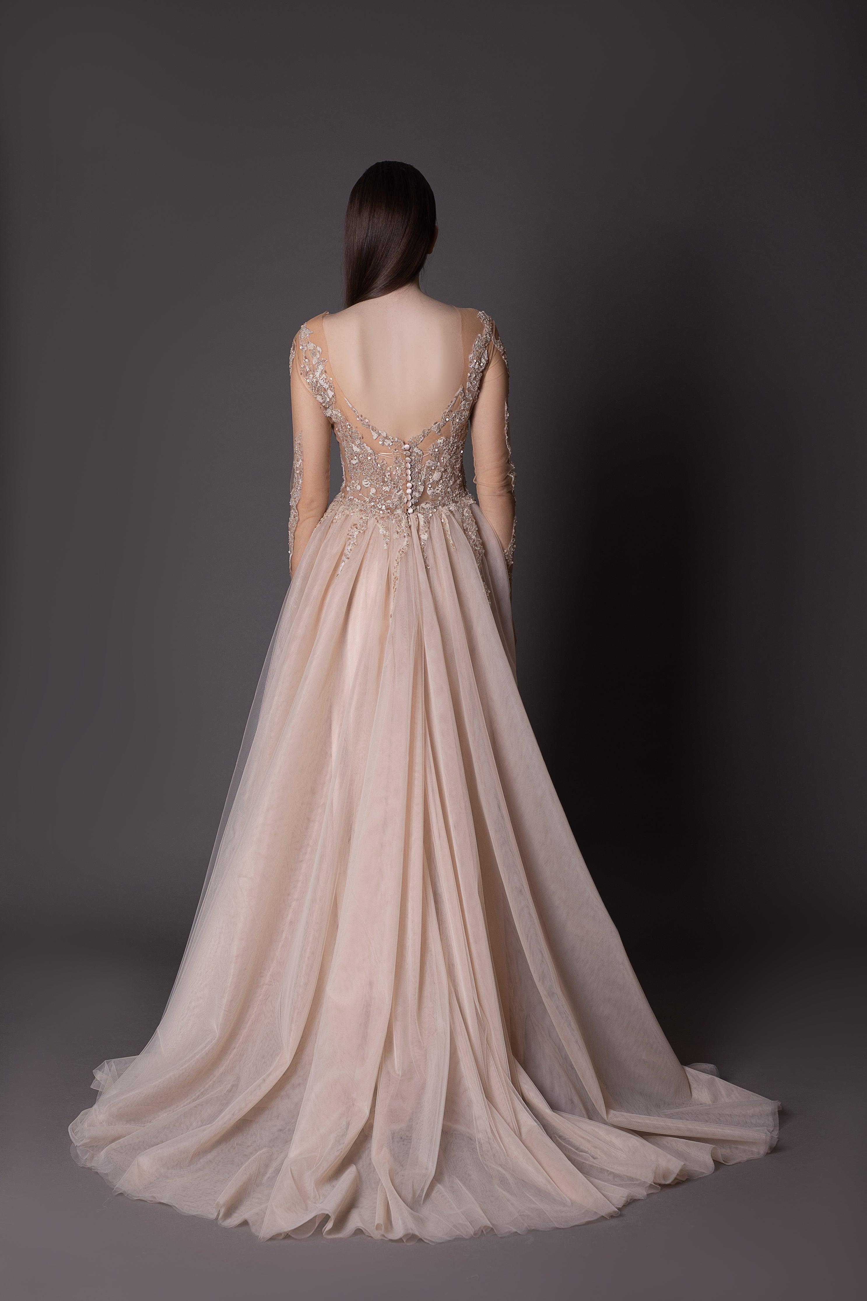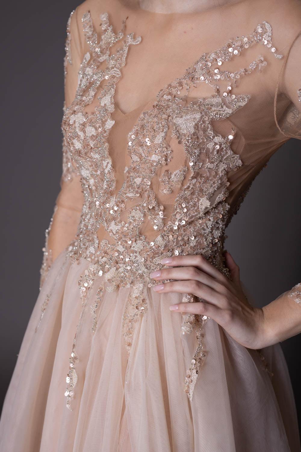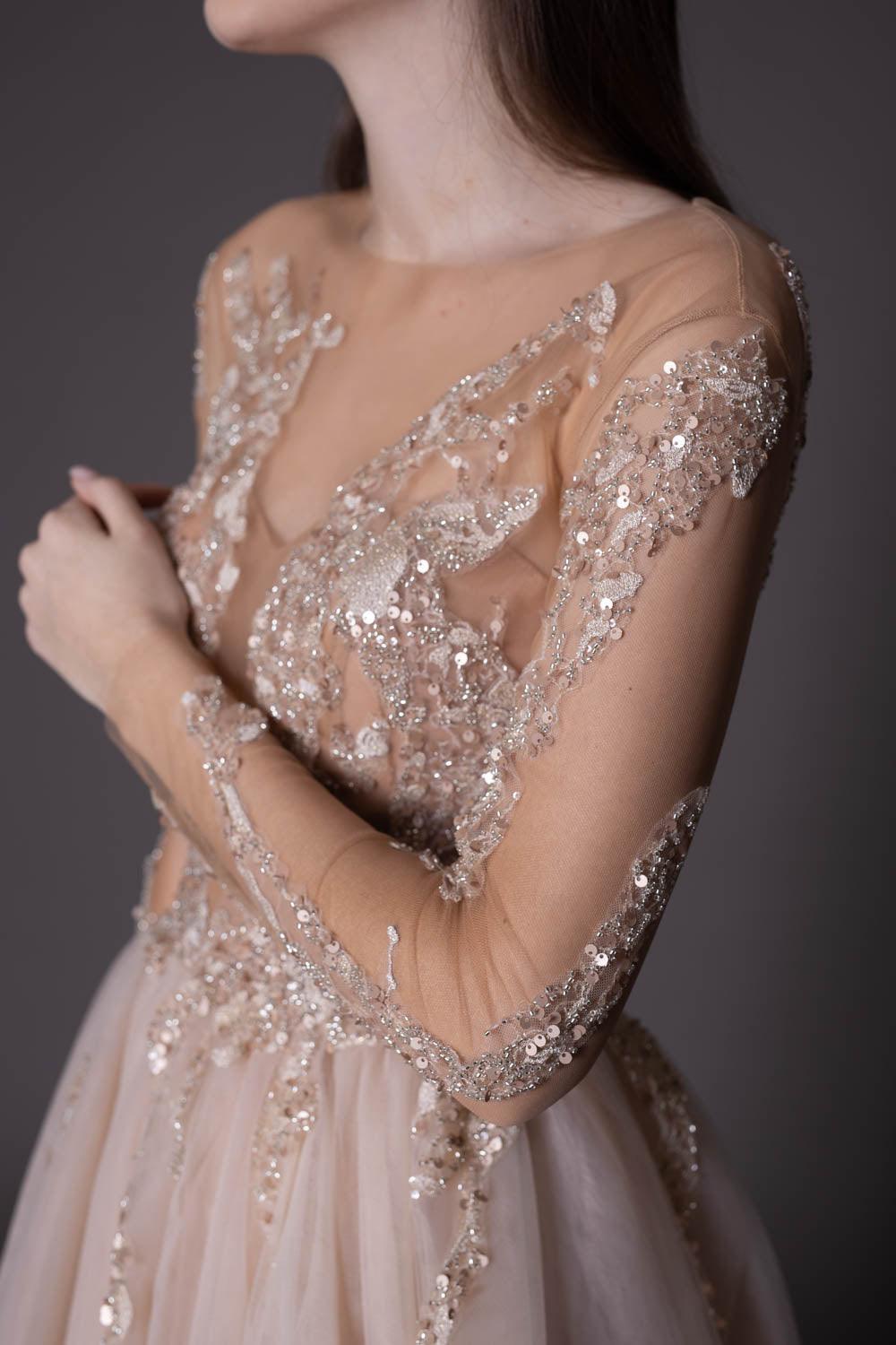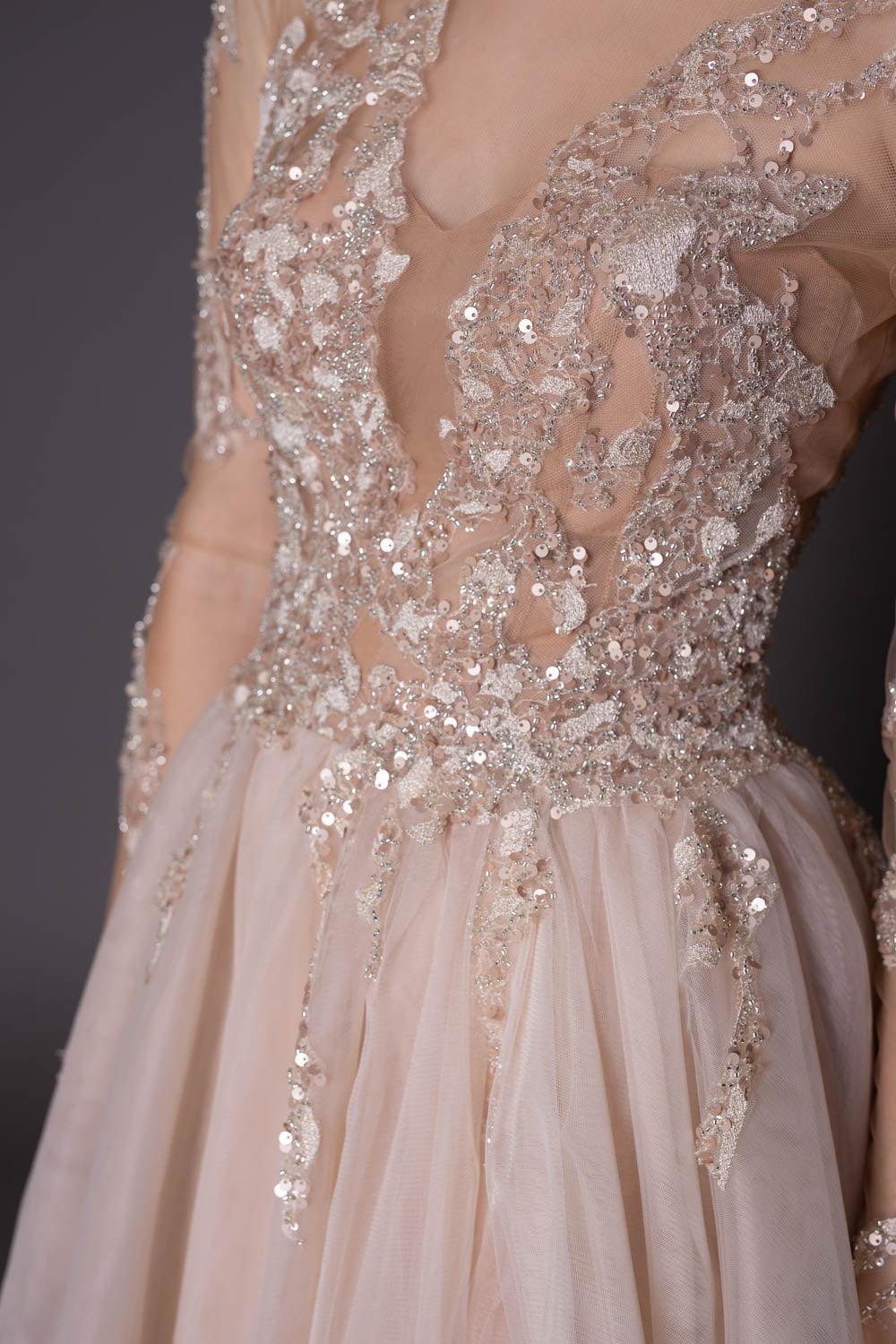 Genießen Sie die zeitlose Eleganz unseres bezaubernden Brautkleides mit langen Ärmeln, das Romantik und Eleganz in sich vereint. In einem verträumten Beigeton mit dezenten Goldtönen strahlt dieses Kleid himmlischen Charme aus – perfekt für die Braut, die an ihrem großen Tag himmlische Schönheit sucht.