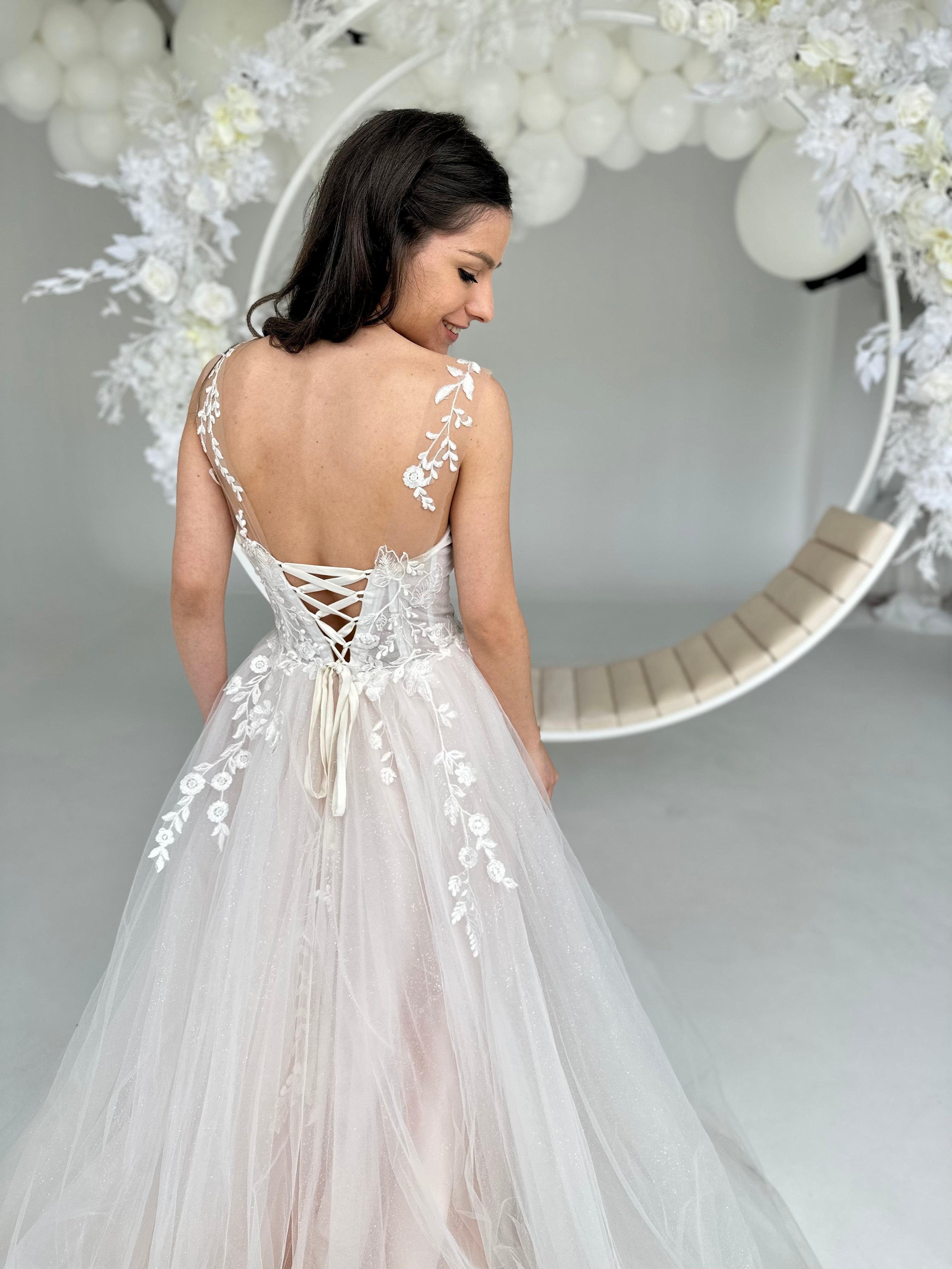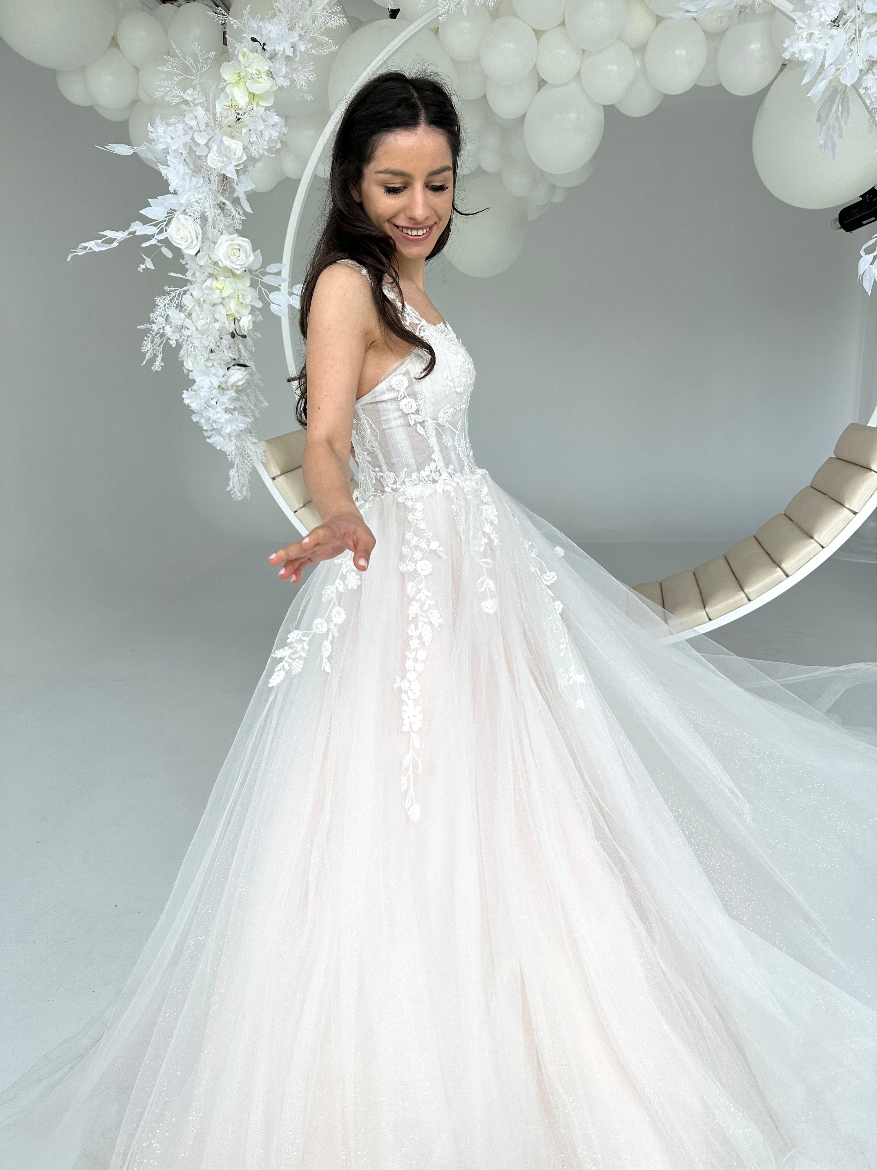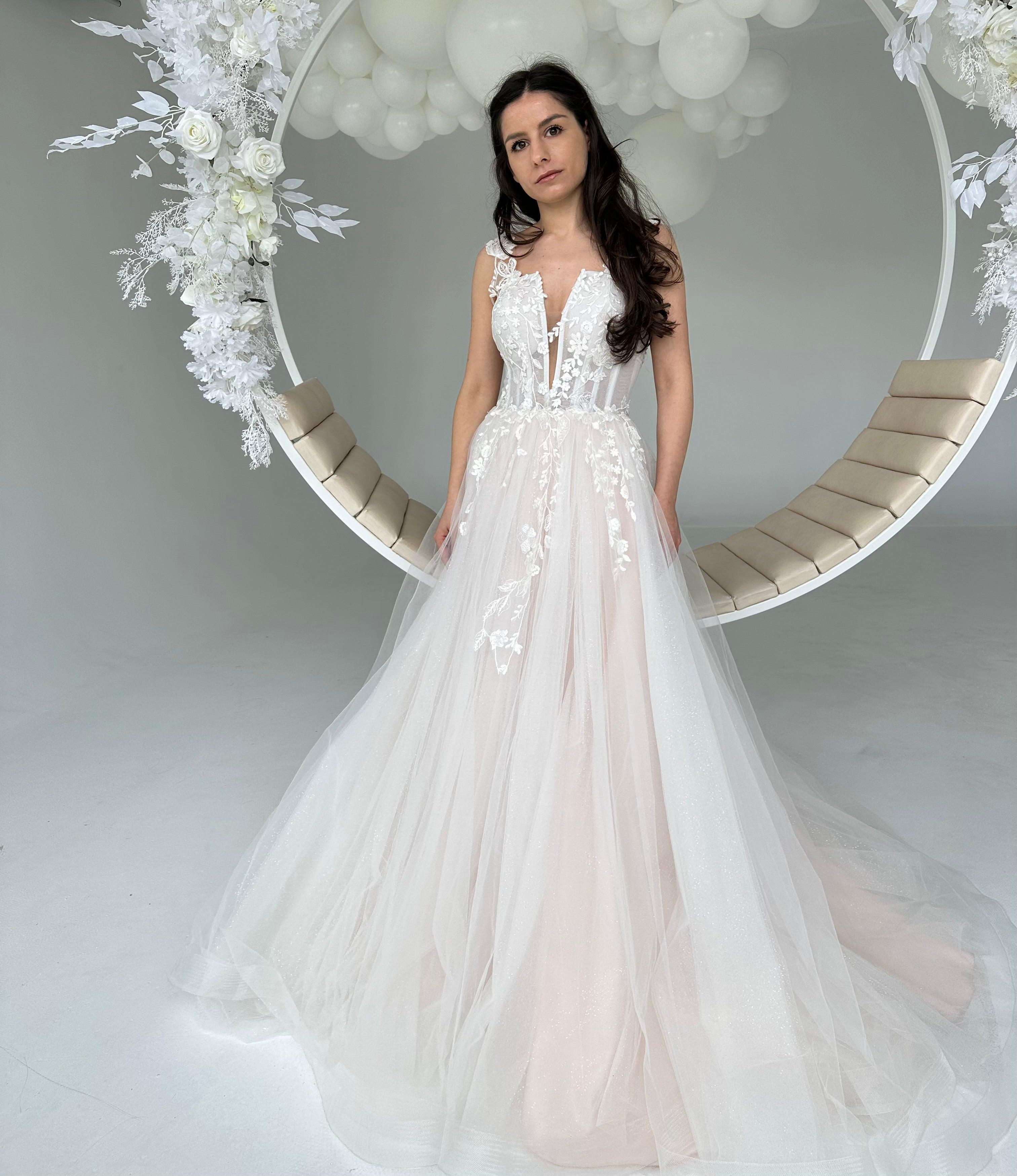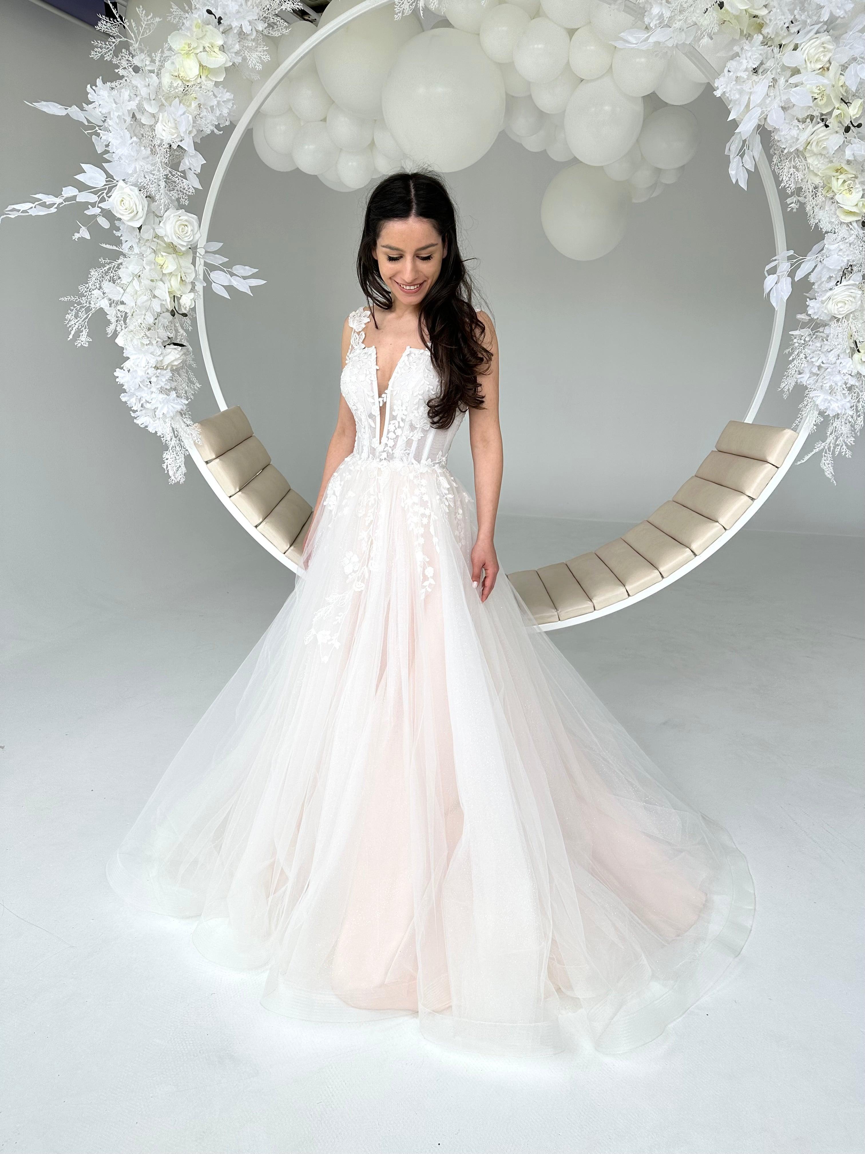 Trotz des gewagten rückenfreien Designs können Sie sicher sein, dass die Brust dank der nahtlos integrierten BH-Cups außergewöhnlichen Halt erhält und so während der gesamten Feierlichkeiten unvergleichlichen Komfort bietet. Das Kleid besticht durch schimmernden Tüll, der über ein zartrosa Futter drapiert ist und bei jedem Schritt zum Altar einen bezaubernden Glanz ausstrahlt.