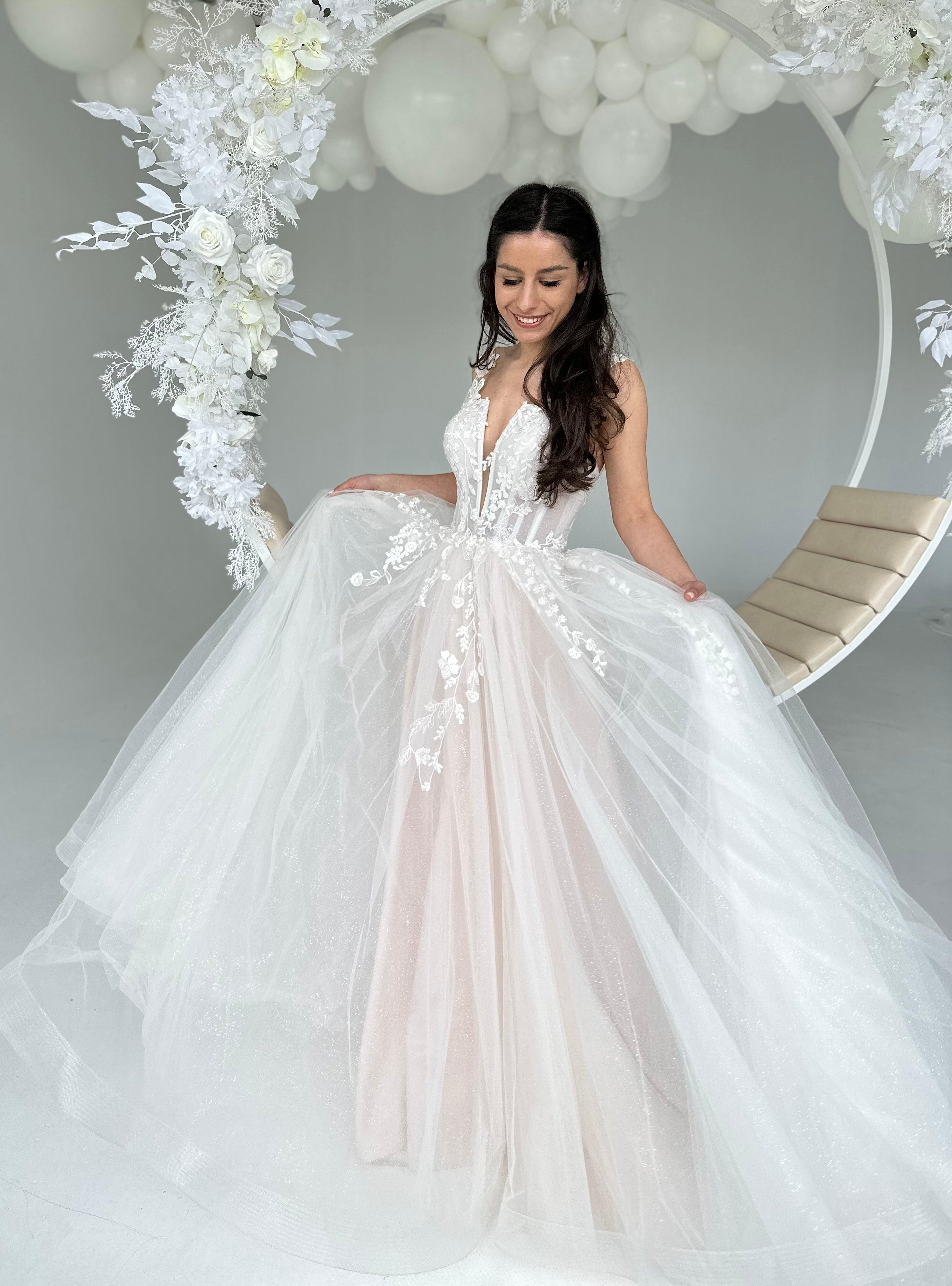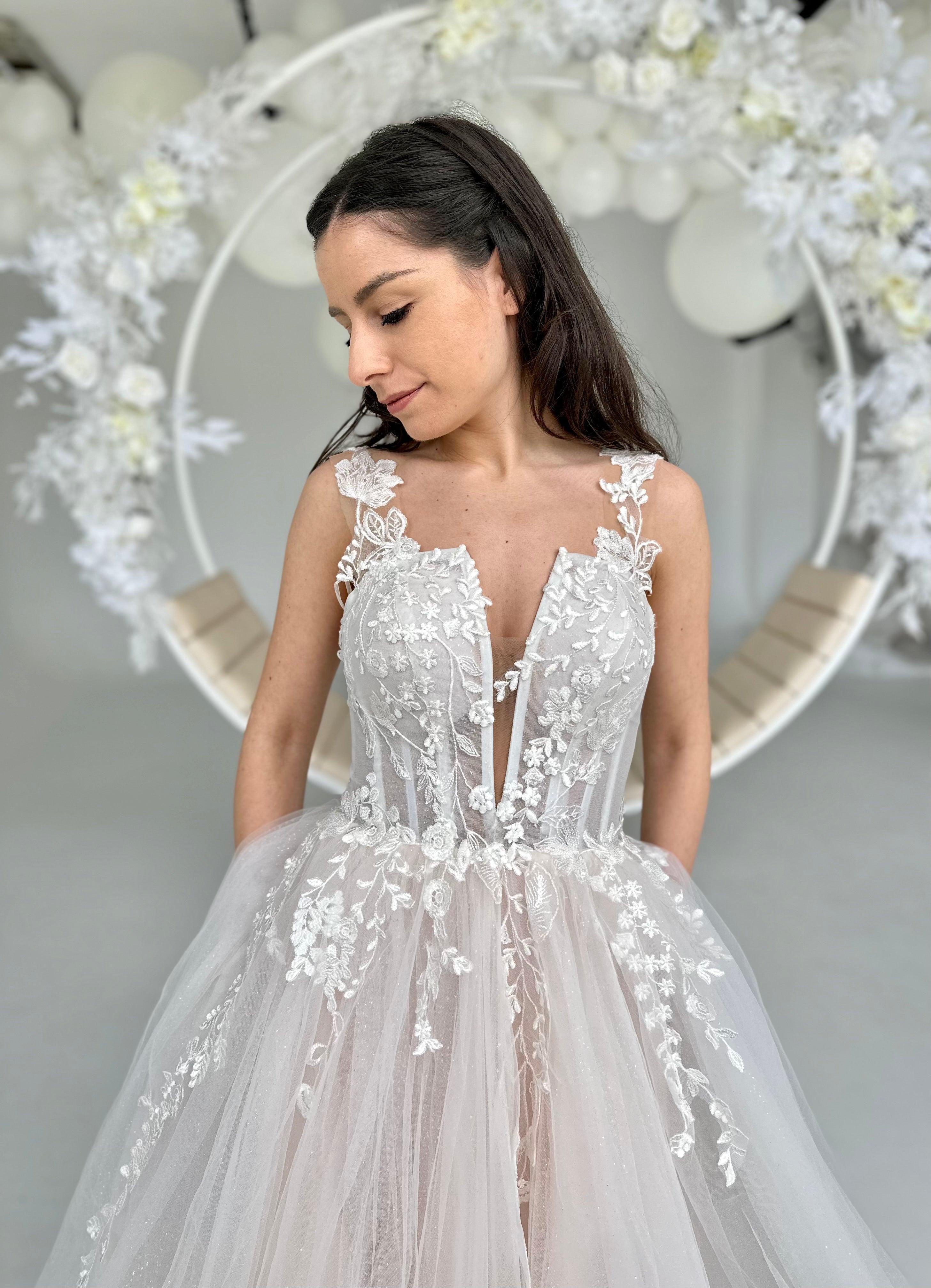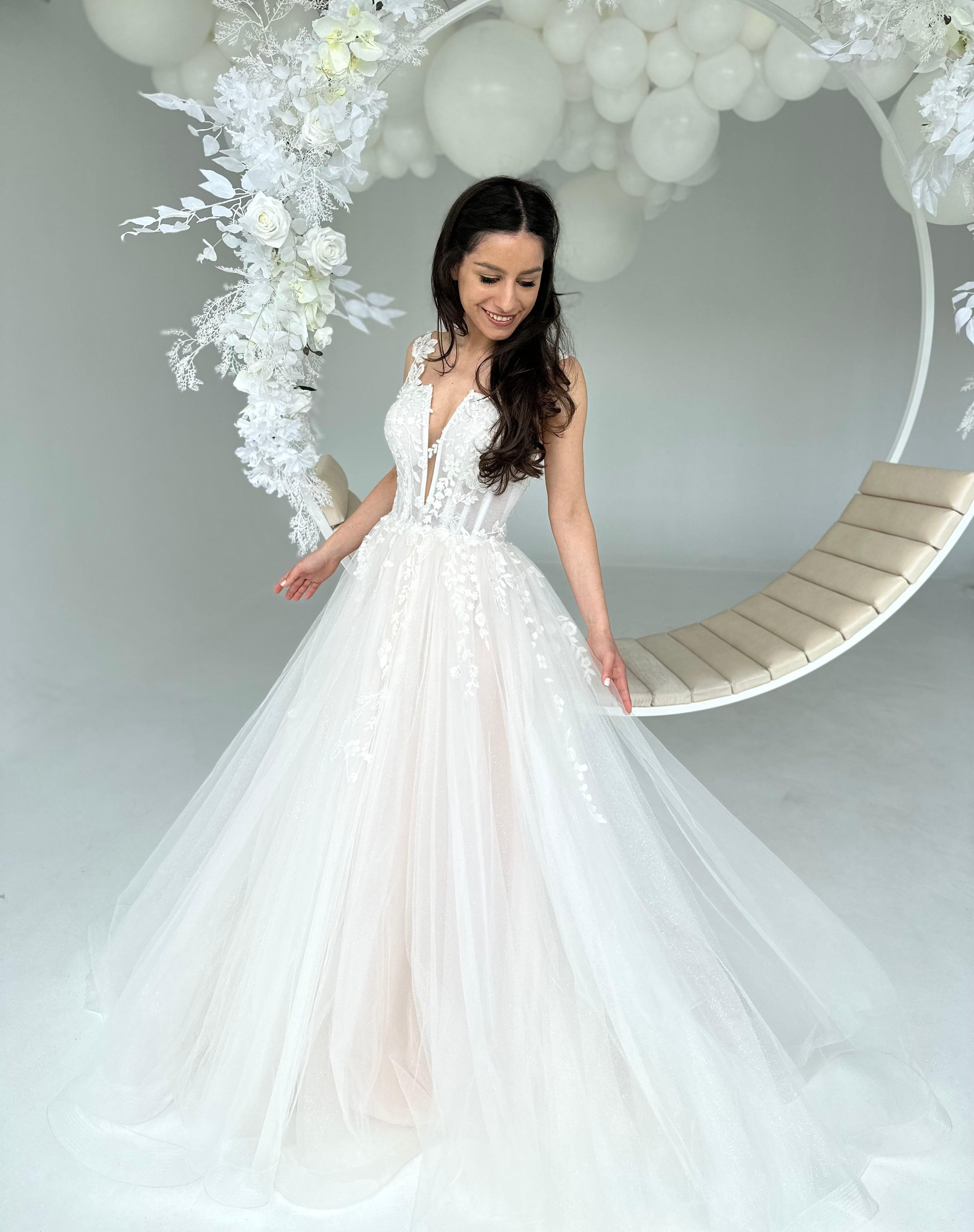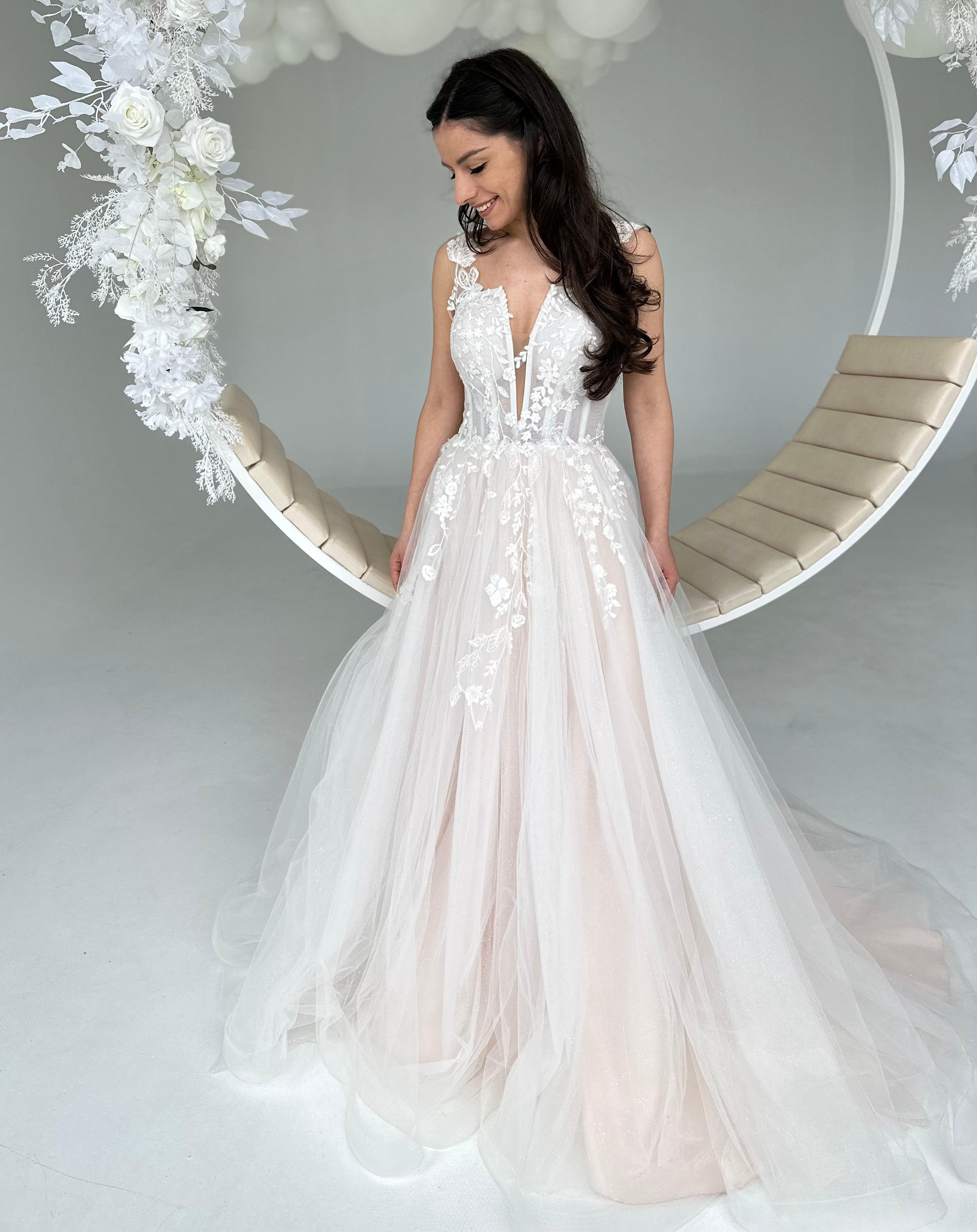 Trotz des gewagten rückenfreien Designs können Sie sicher sein, dass die Brust dank der nahtlos integrierten BH-Cups außergewöhnlichen Halt erhält und so während der gesamten Feierlichkeiten unvergleichlichen Komfort bietet. Das Kleid besticht durch schimmernden Tüll, der über ein zartrosa Futter drapiert ist und bei jedem Schritt zum Altar einen bezaubernden Glanz ausstrahlt.
