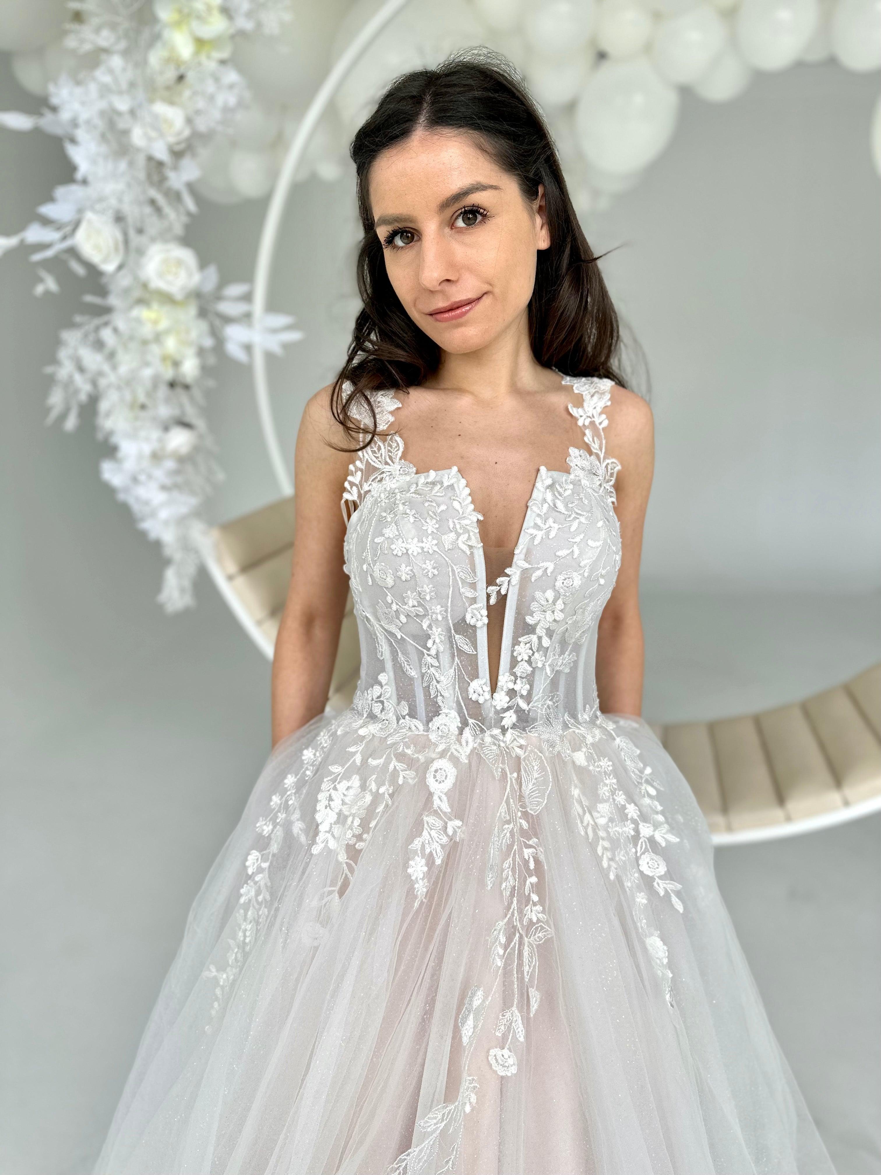Lassen Sie sich von der exquisiten Handwerkskunst dieses einzigartigen Brautkleides verzaubern, das mit sorgfältig handgeschnittenen, aufwendig verzierten Blumenornamenten verziert ist. Das atemberaubende Korsett besticht nicht nur durch seine makellose Passform, sondern sorgt auch für unvergleichlichen Tragekomfort.