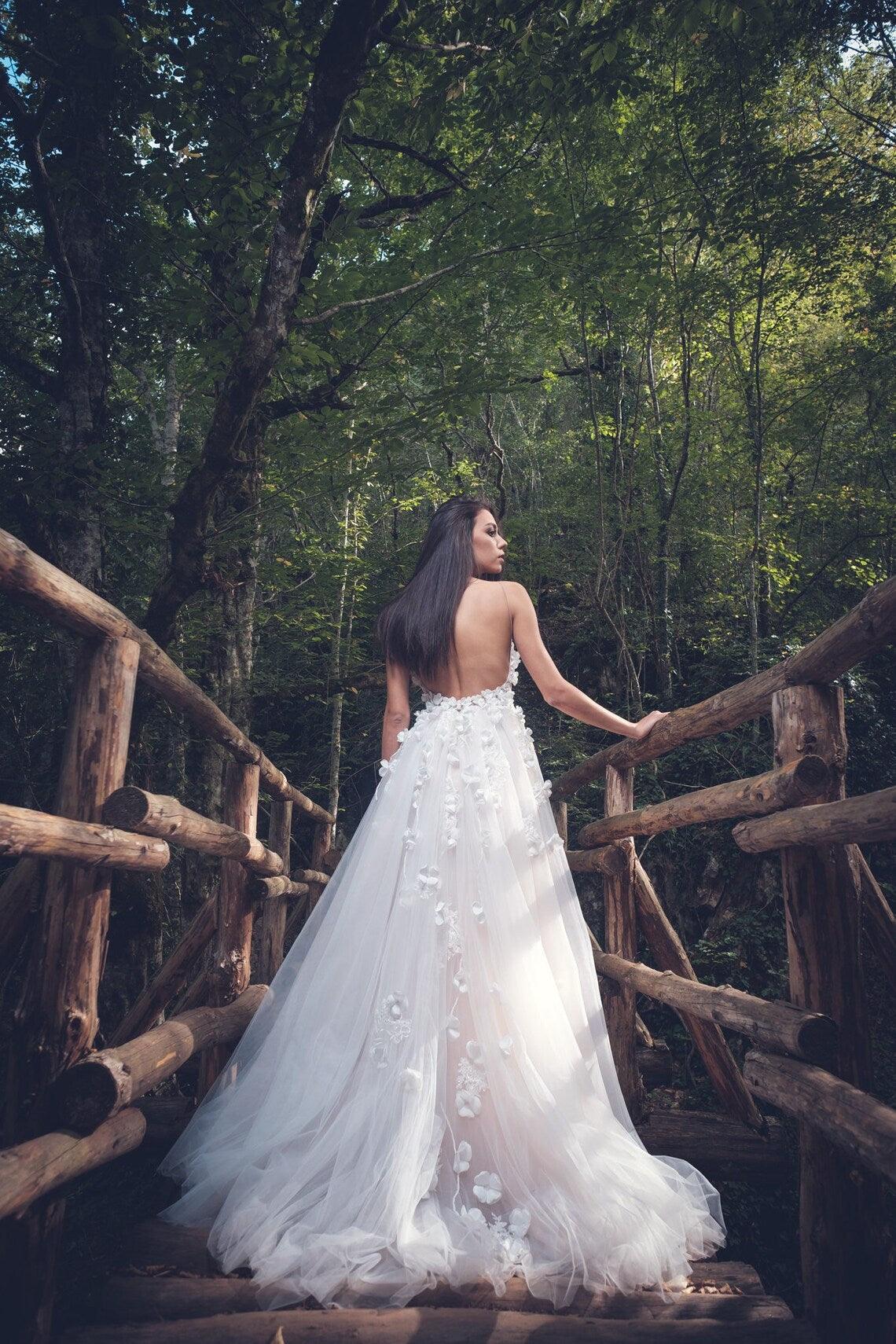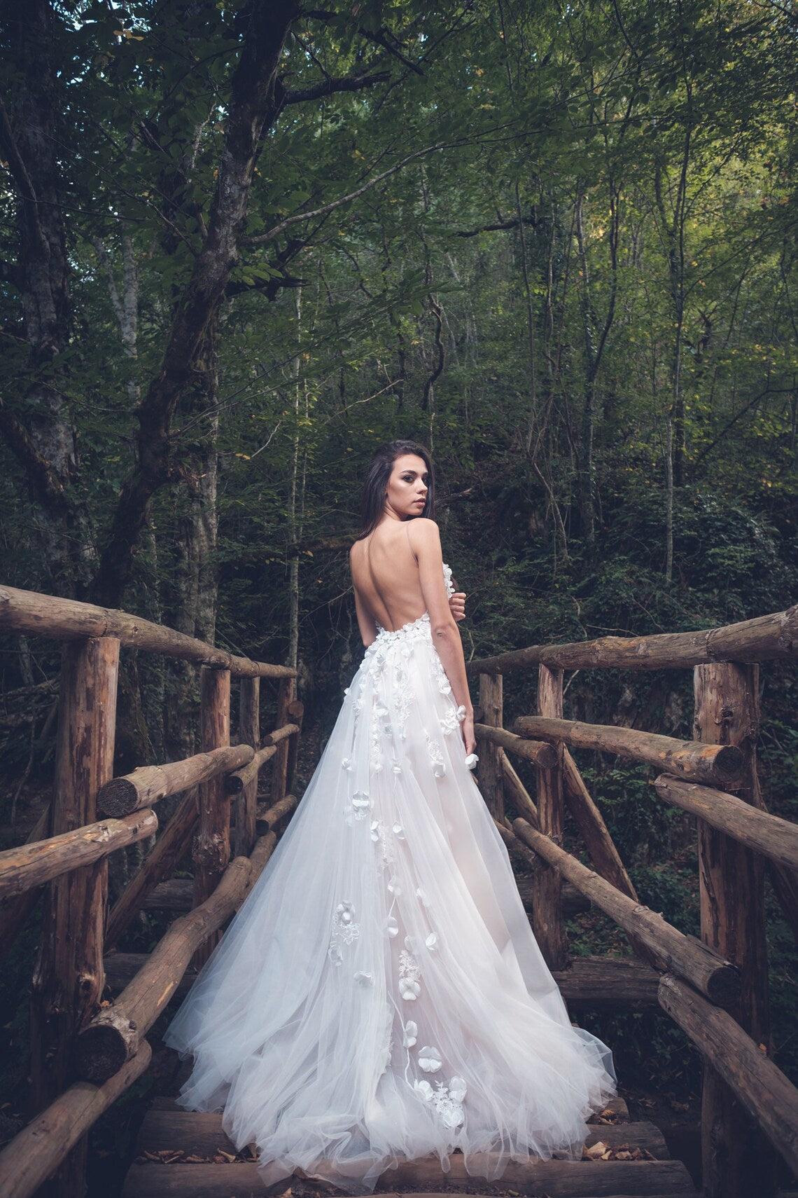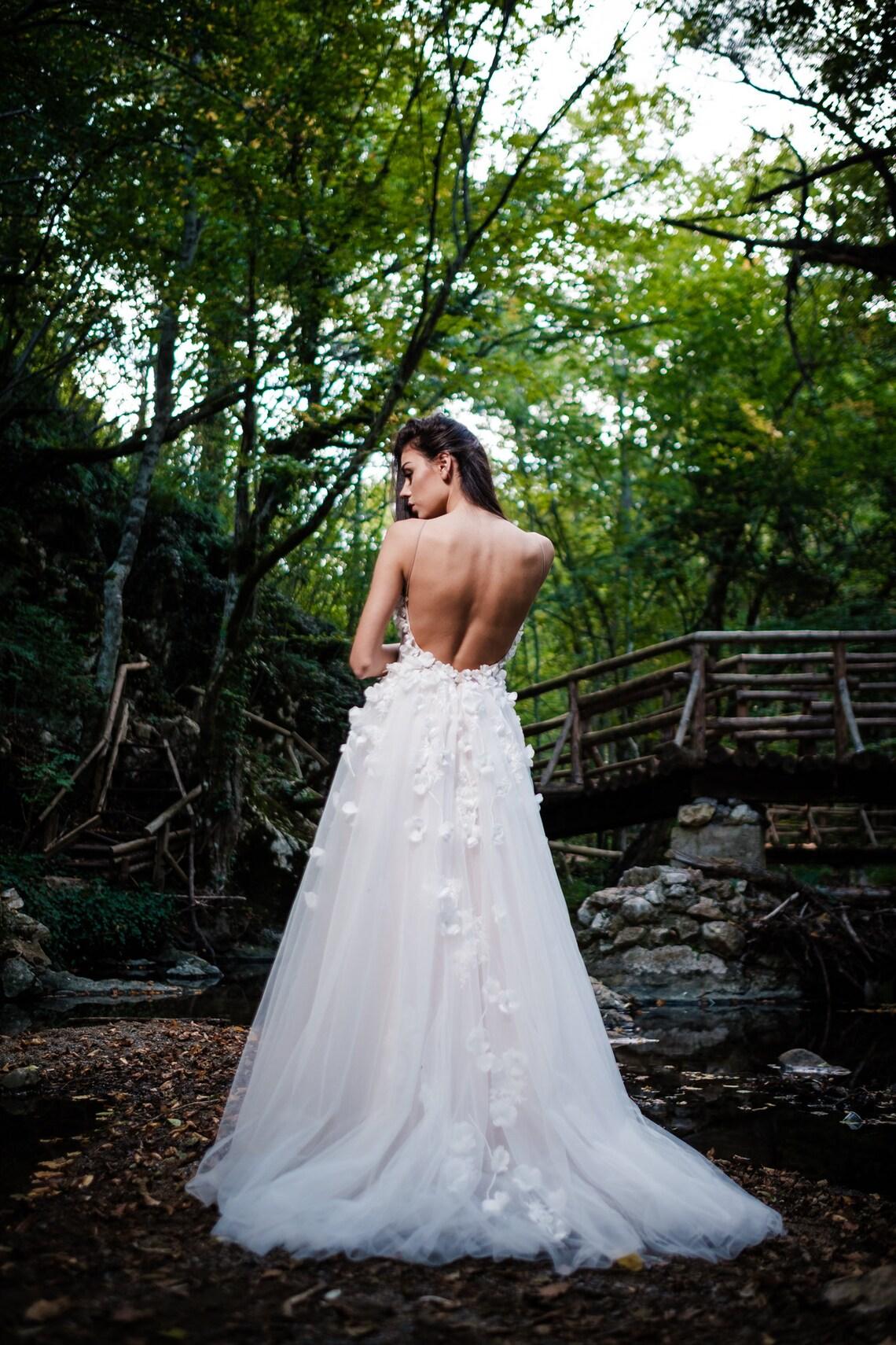 Das florale Brautkleid besticht durch eine bezaubernde A-Linien-Silhouette und einen anmutig tiefen Rückenausschnitt. Sein einzigartig verführerisches Design wurde sorgfältig gefertigt, um die Konturen Ihres Körpers zu betonen und zu betonen. Ob für eine moderne, Boho- oder schlichte Hochzeit – dieses Blumenbrautkleid vereint mühelos schicke Eleganz mit femininem Charme. Über 250 kunstvoll handgeschnittene und mit Perlen verzierte Blumen schaffen ein atemberaubendes Meisterwerk, das Kunstfertigkeit und Eleganz perfekt vereint.