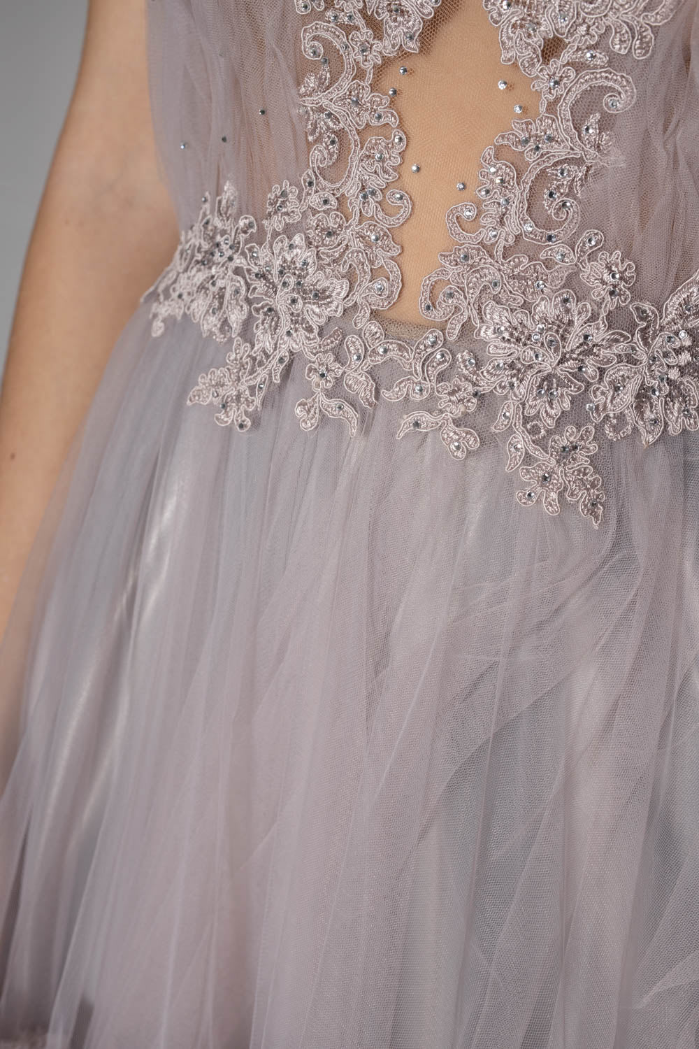 Mauve tiered tulle evening gown with illusion deep V-neckline, floral embroidery, and tiered skirt.