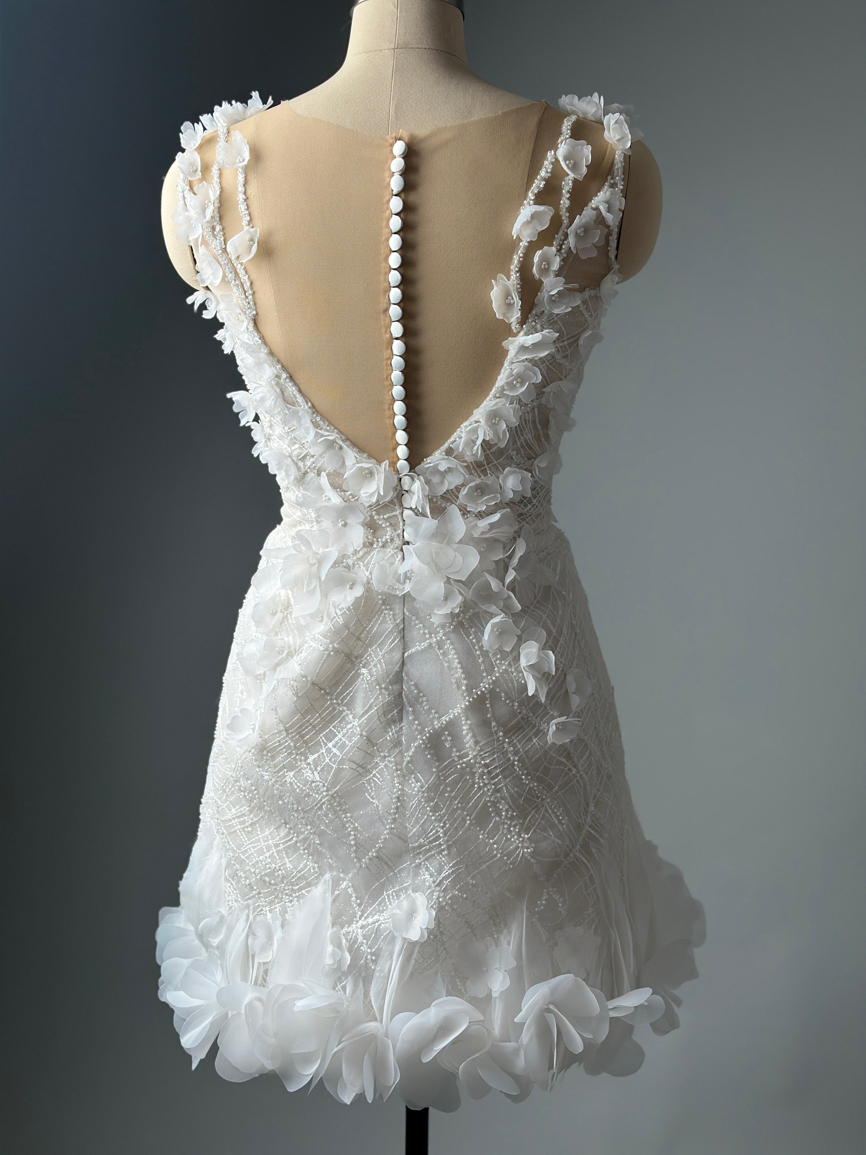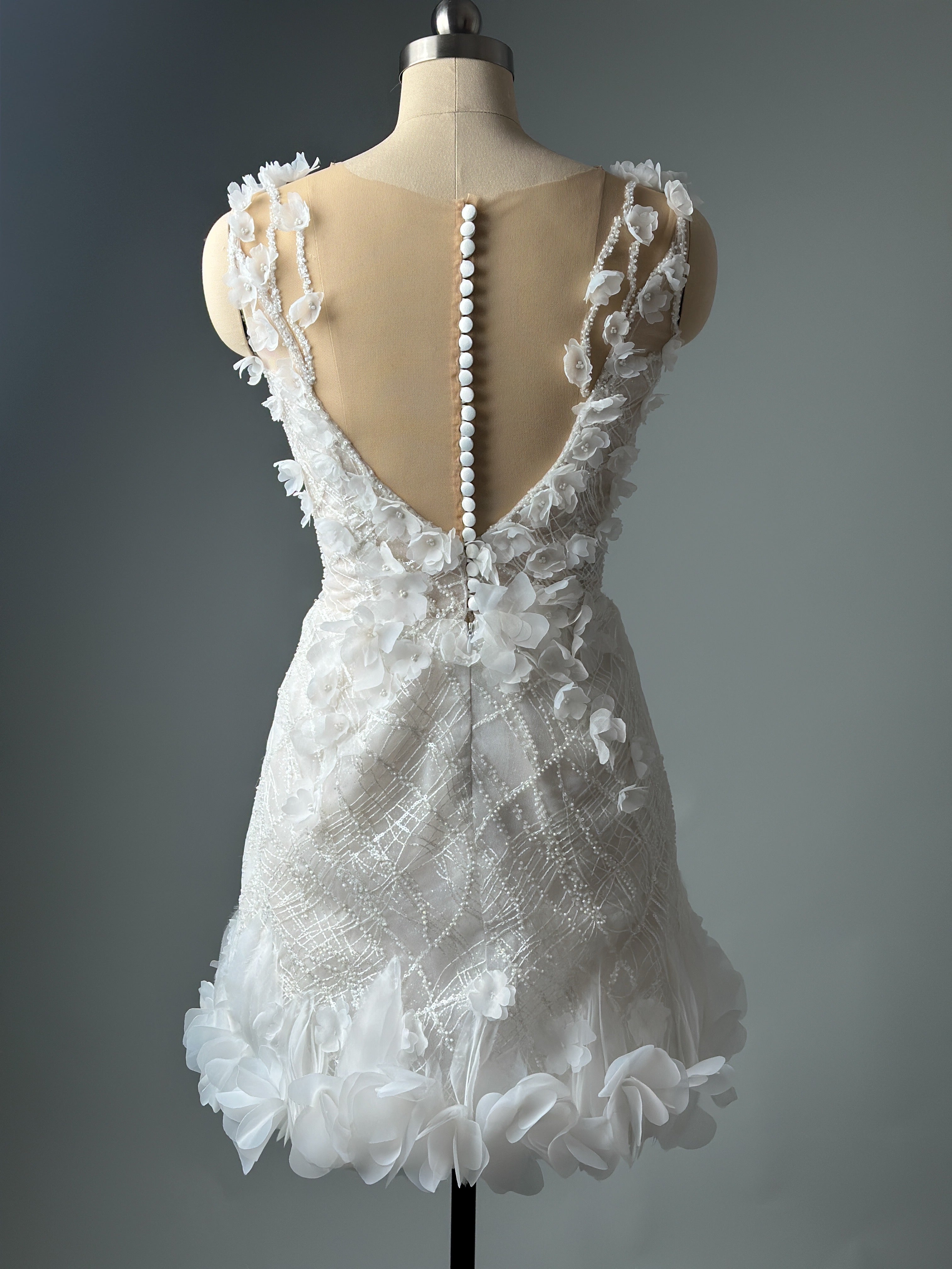 Das florale Mini-Brautkleid besticht durch zarte Spitze, verziert mit handgefertigten 3D-Blumen, und bietet eine weiche, romantische Textur mit einer schicken Silhouette. Es ist auf Bewegungsfreiheit, Leichtigkeit und einen unvergesslichen Stil ausgelegt und eignet sich perfekt für Hochzeiten, standesamtliche Trauungen, Empfänge oder als elegantes zweites Hochzeitskleid.