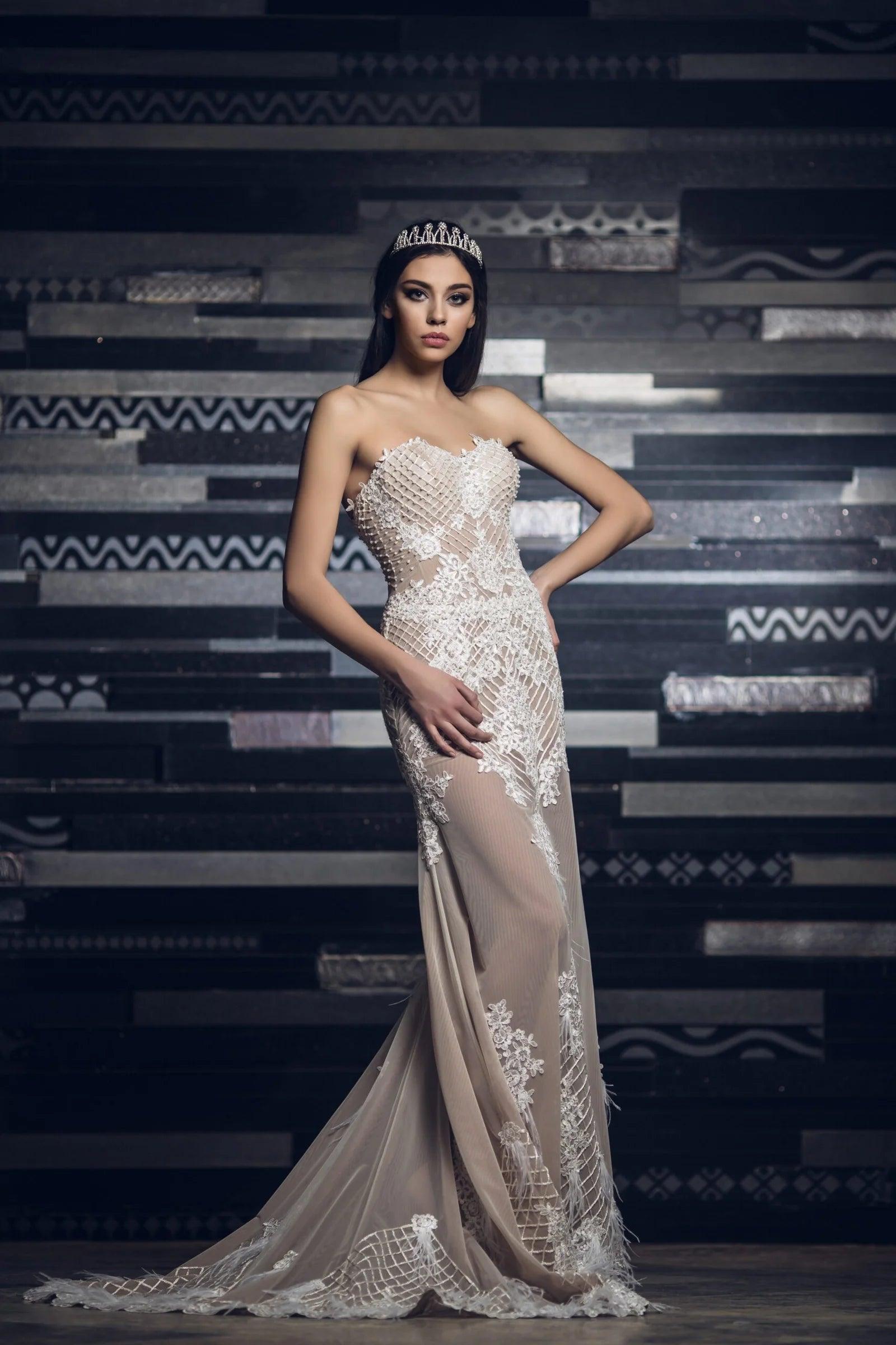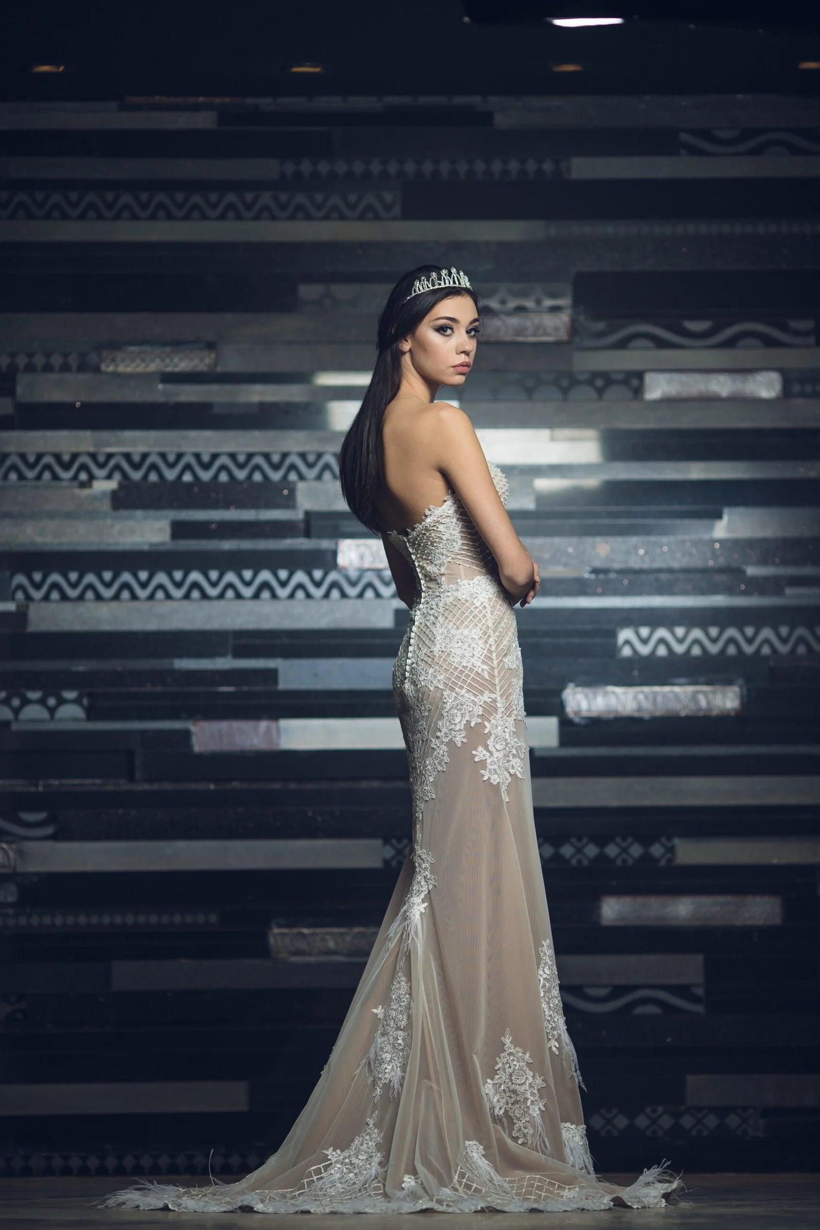 Mit seiner abnehmbaren Schleppe bietet dieses Kleid Vielseitigkeit, während das perfekt sitzende Korsett nicht nur eine perfekte Silhouette, sondern auch unvergleichlichen Tragekomfort garantiert. Das Brautkleid in einem wunderschönen Elfenbeinton kann individuell an die Wünsche der Kundin angepasst werden und sorgt so für ein wahrhaft maßgeschneidertes und unvergessliches Hochzeitsensemble.