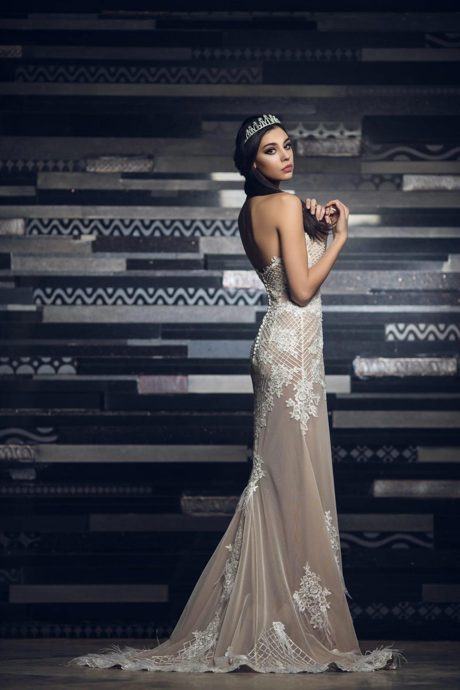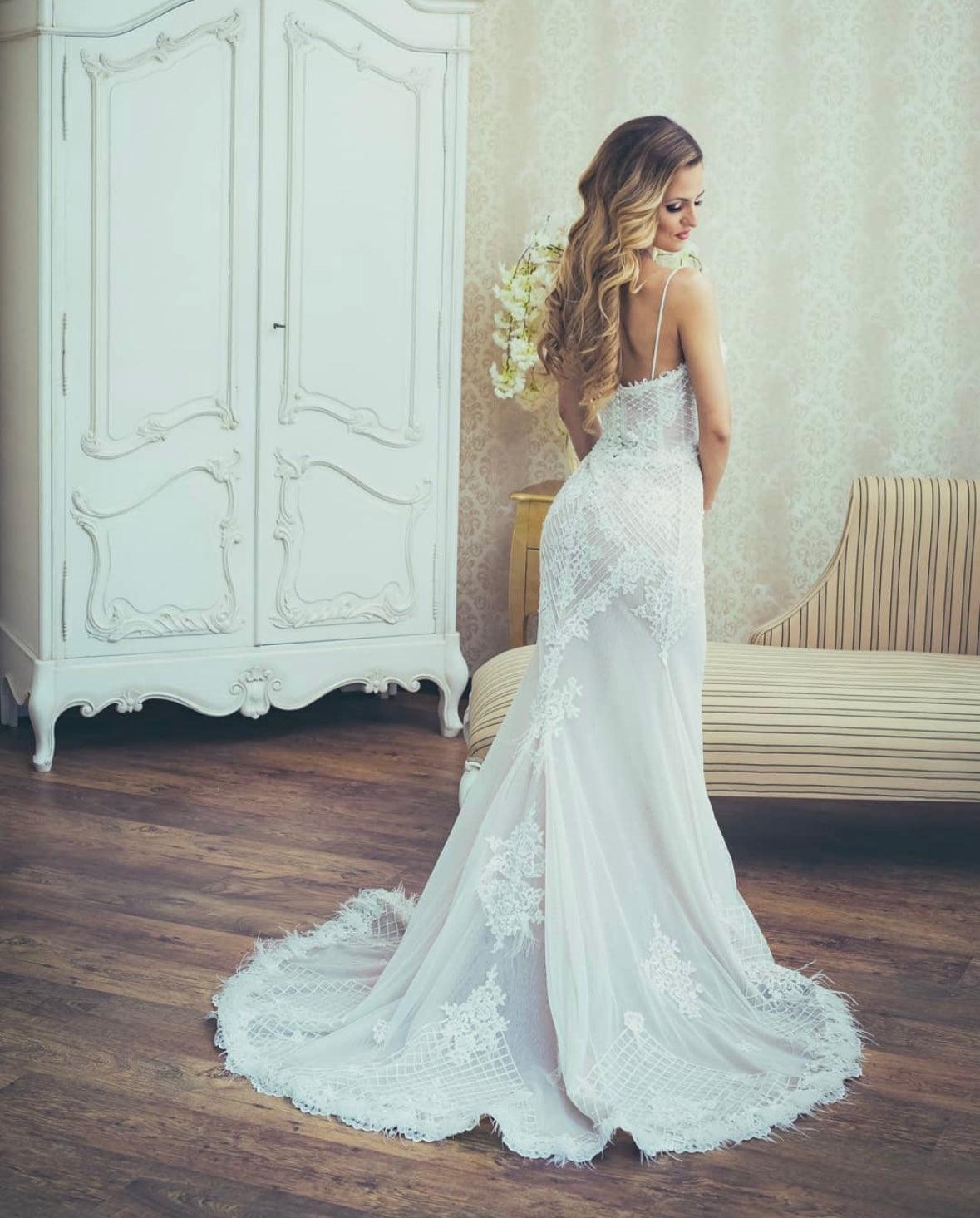 Das Spitzenbrautkleid besticht durch einen Rückenverschluss mit sorgfältig handgefertigten Knöpfen, die ihm einen Hauch handwerklicher Eleganz verleihen. Das detailreiche Kleid besticht durch sorgfältig handgeschnittene Blumenornamente und Perlen, die kunstvoll appliziert wurden, um seinen Reiz zu unterstreichen und die anmutige weibliche Silhouette zu betonen.
