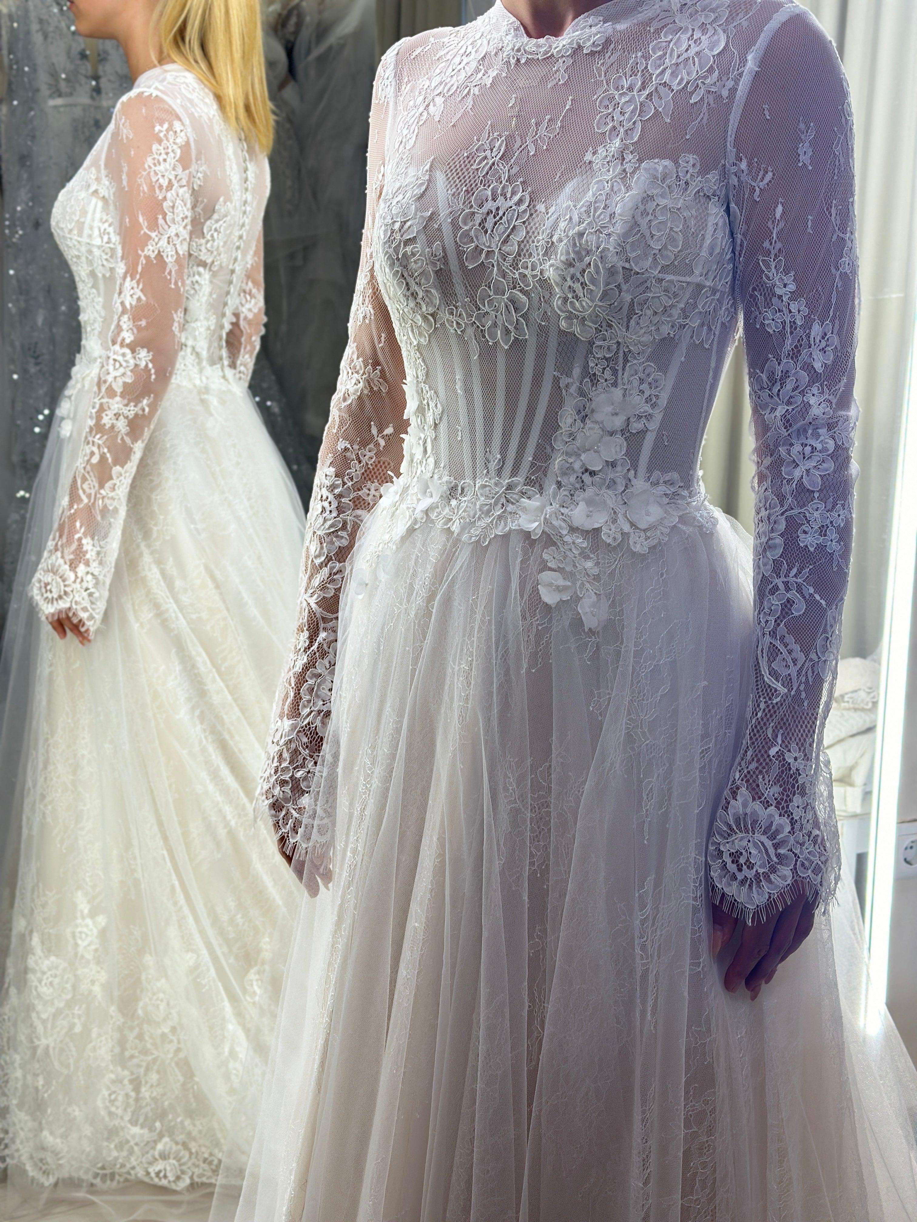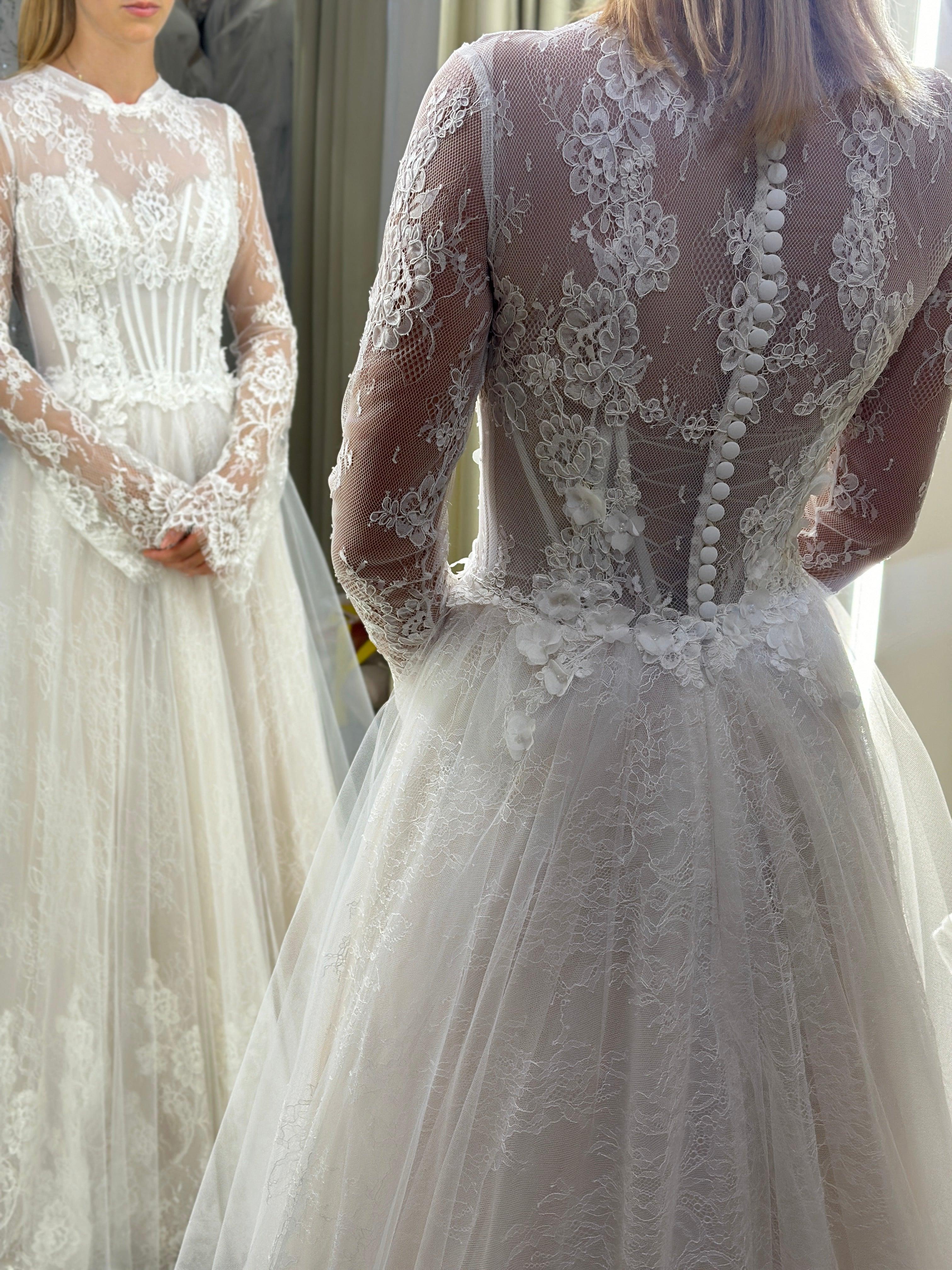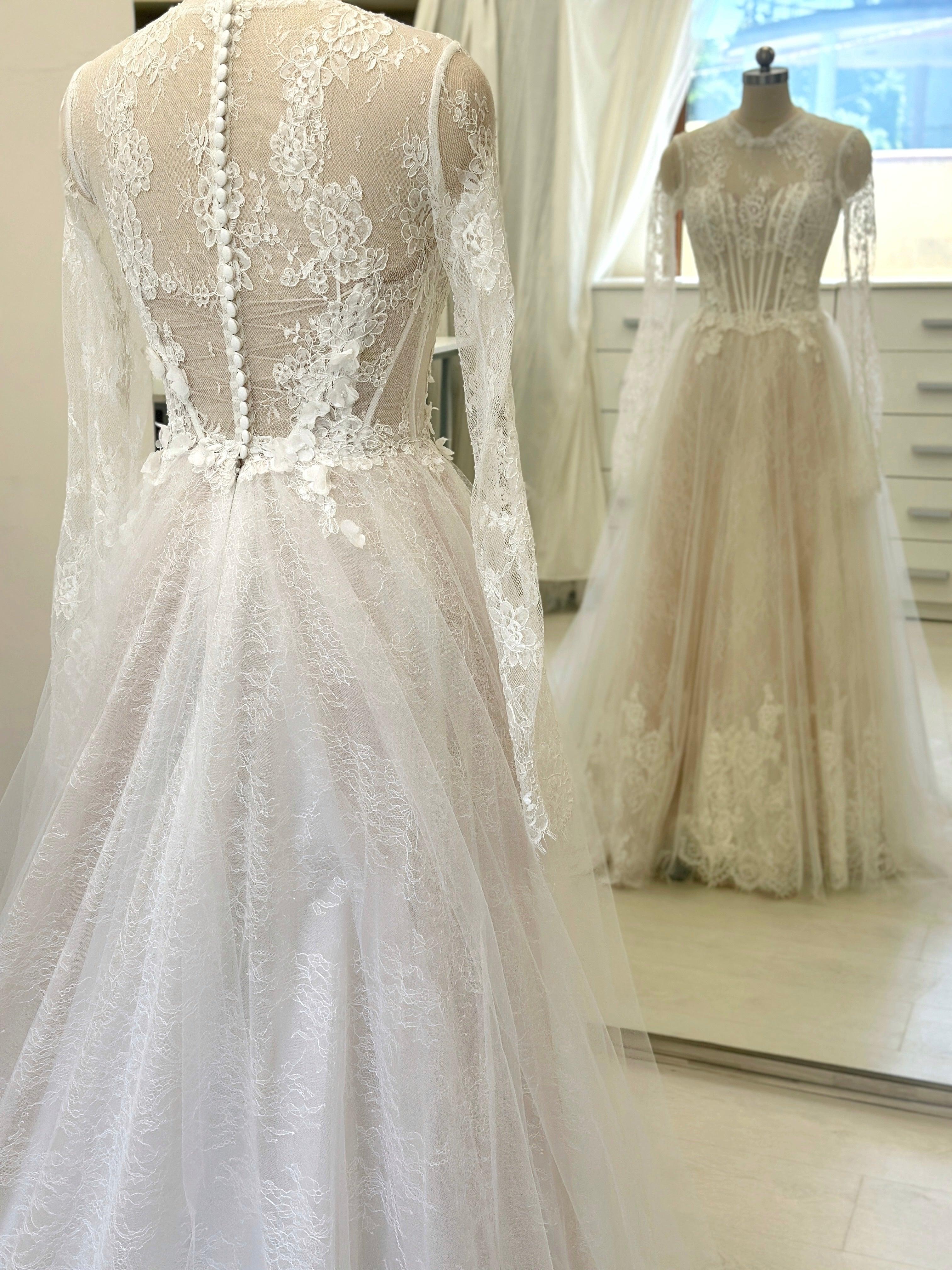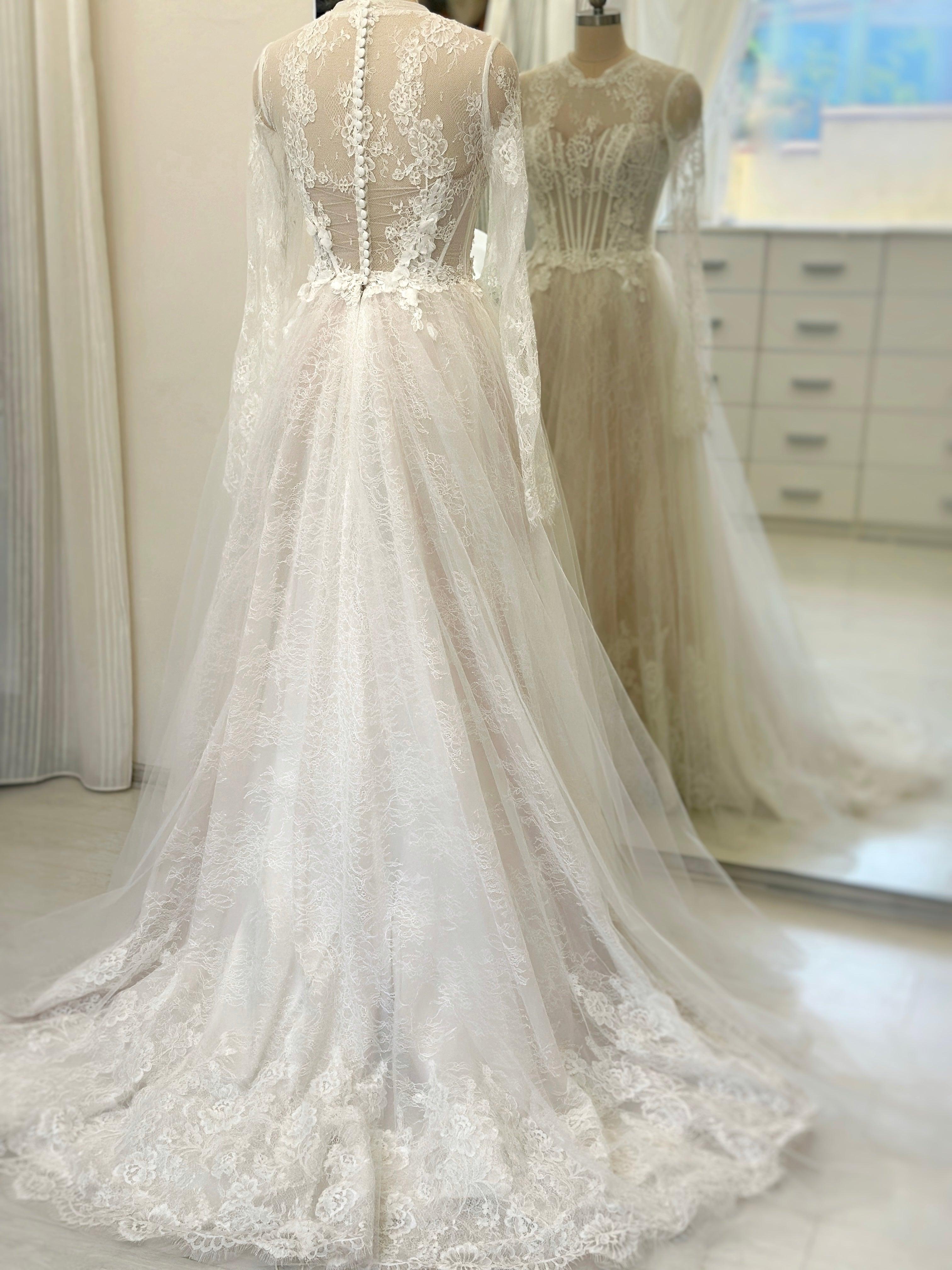 Turtleneck wedding dress Maggie that embodies timeless elegance and modern sophistication. Floral lace A-line bridal gown is meticulously crafted to perfection, featuring delicate Italian lace top that create a romantic and ethereal look. The back closes with 30 handmade buttons. Bodice features an inside corset, providing excellent support and a flattering fit.