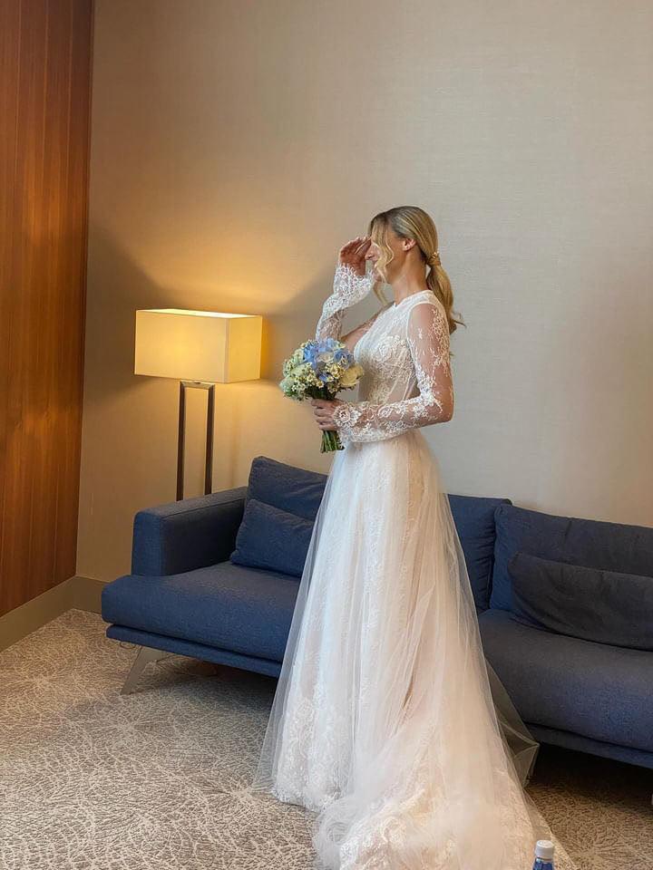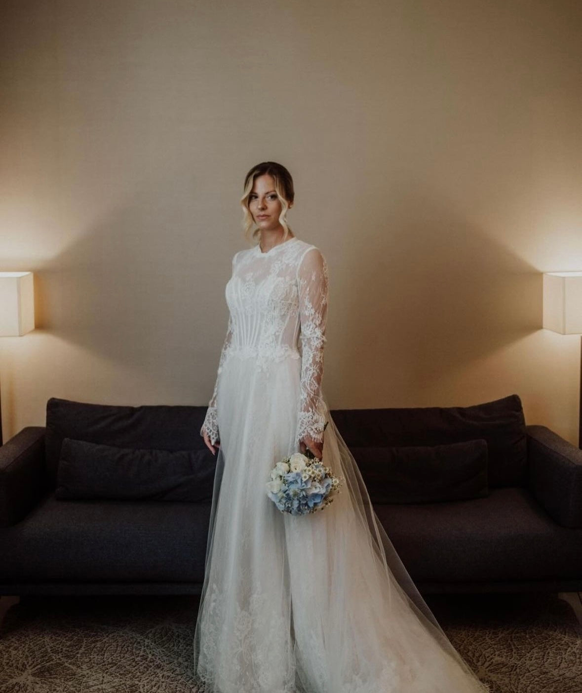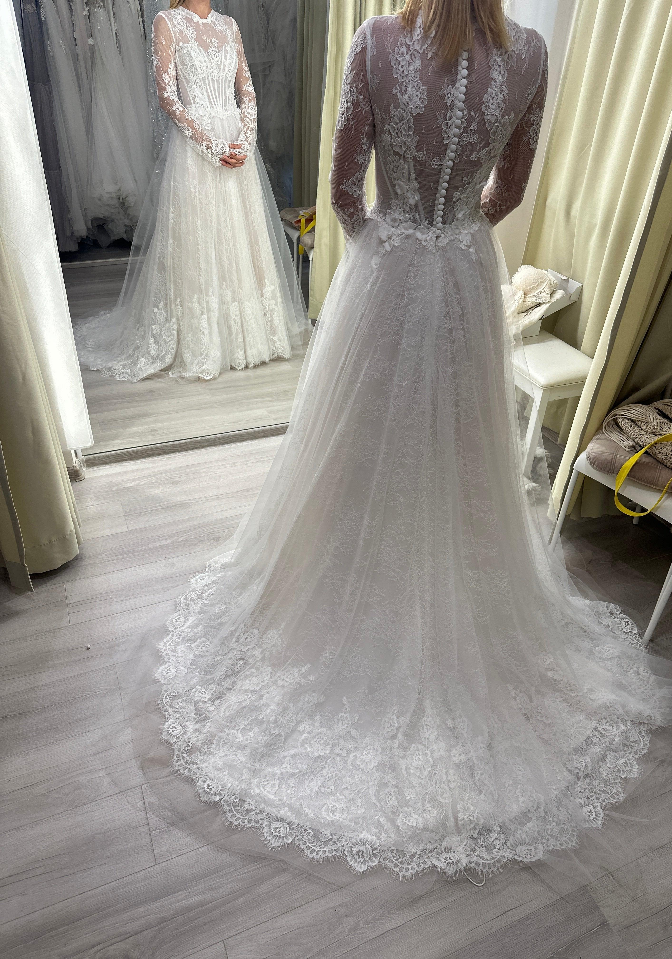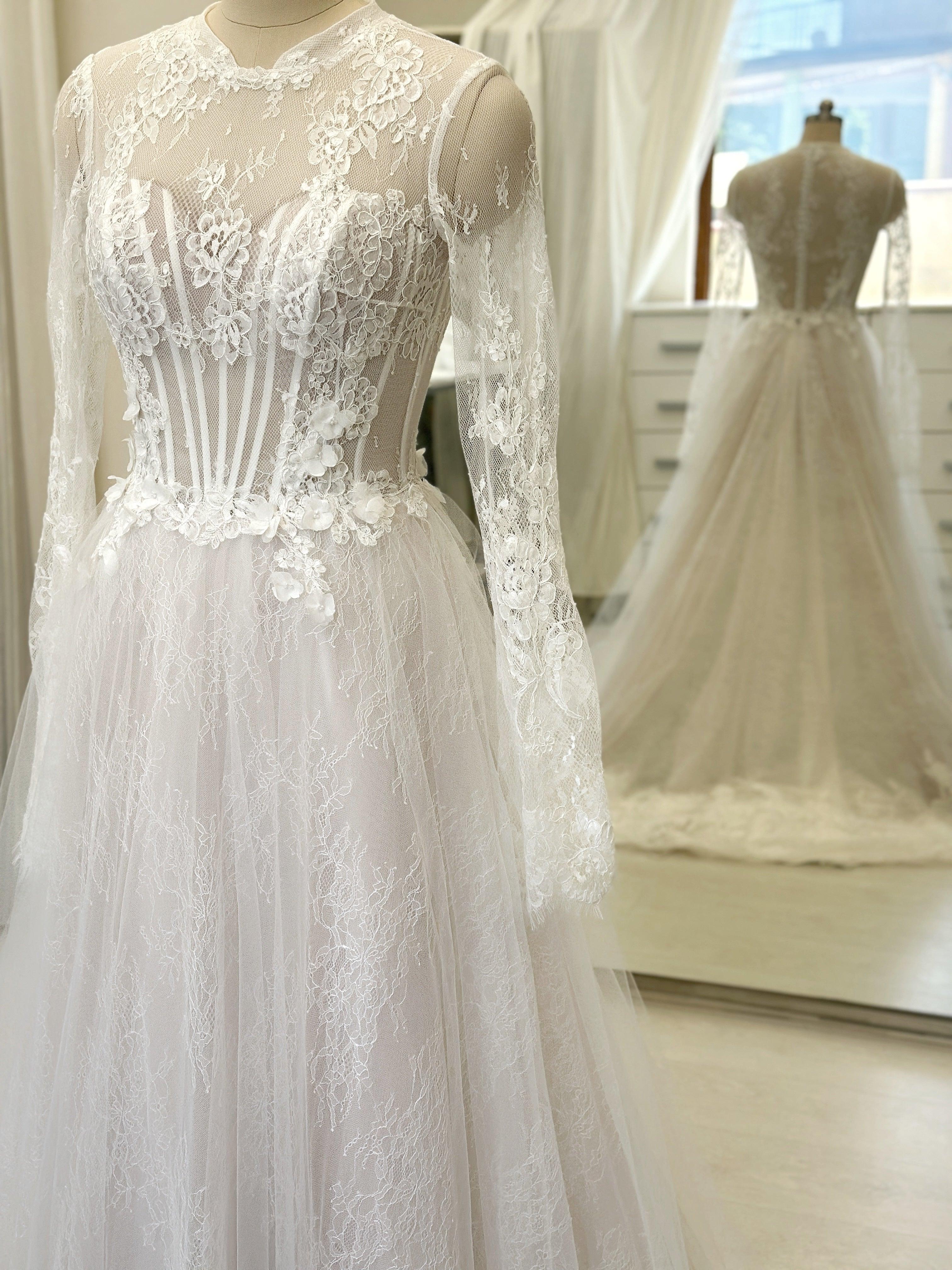 Turtleneck wedding dress Maggie that embodies timeless elegance and modern sophistication. Floral lace A-line bridal gown is meticulously crafted to perfection, featuring delicate Italian lace top that create a romantic and ethereal look. The back closes with 30 handmade buttons. Bodice features an inside corset, providing excellent support and a flattering fit.
