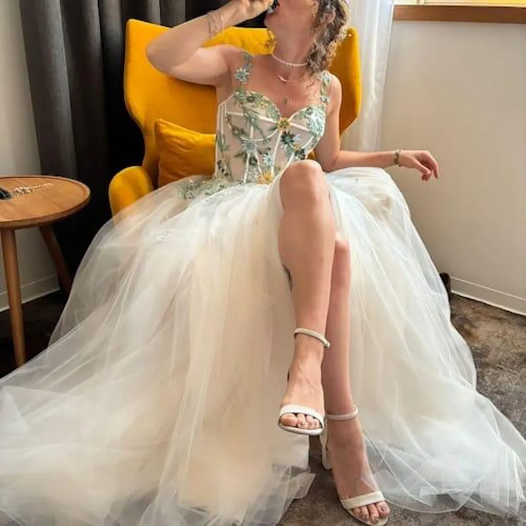 WOW! Mariya created a true art piece of a wedding dress for my special day. She is such a pleasure to work with! Not only did she adjust the colors and lace organization to perfectly match the forest fairy vibe, she's also so sweet and thorough in communication. She kept adjusting the lace until it was just right for me, which is such an incredible service. The quality of the dress is incredible as well. She got stepped on so many times (there's a lot of dancing and a Serbian wedding), but not a single thread got damaged. Also ladies, don't be scared about fitting. No idea how she does it but Mariya made the dress fit like a glove based on the measurements.