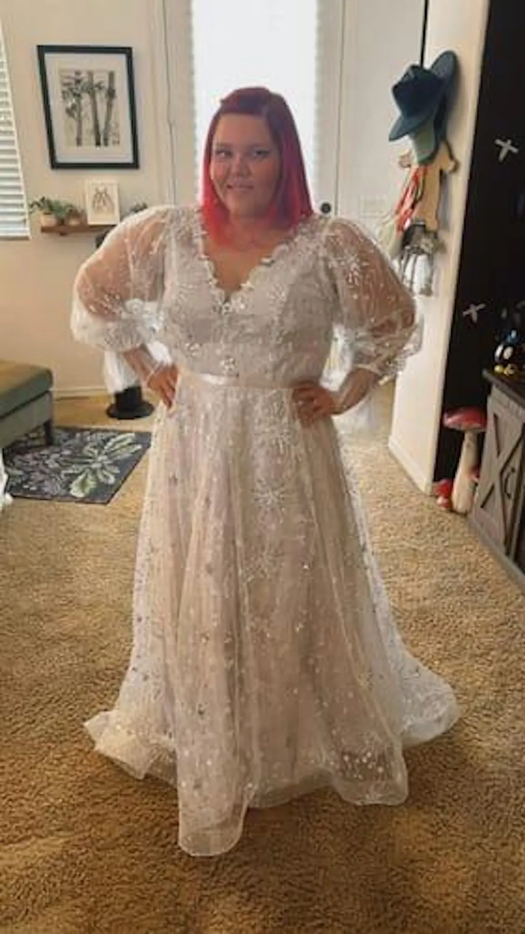 Beautiful dress!! Exactly as pictured. Looking forward to wearing on my wedding day!! Thank you for making customizations for my needs. I appreciate you!!