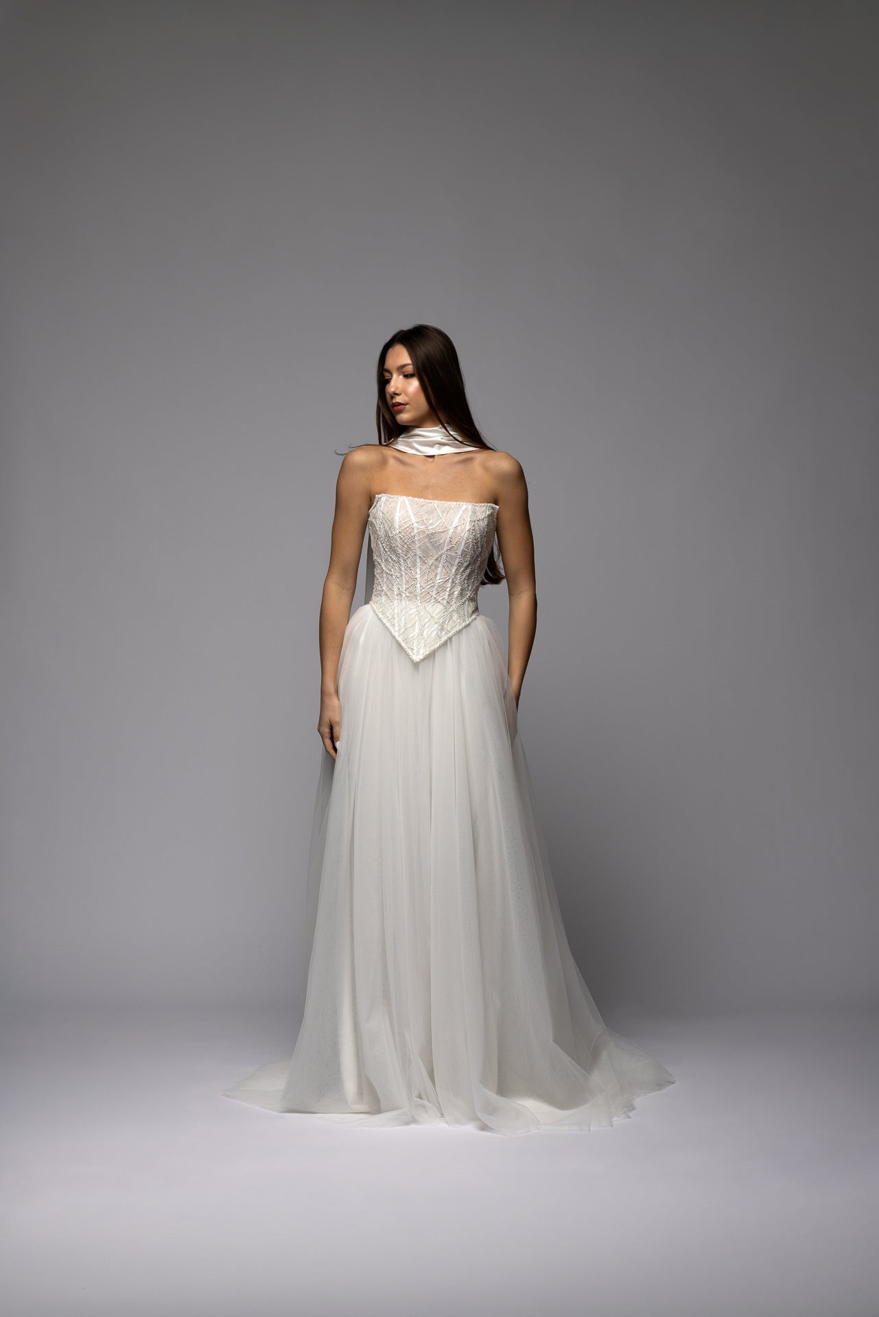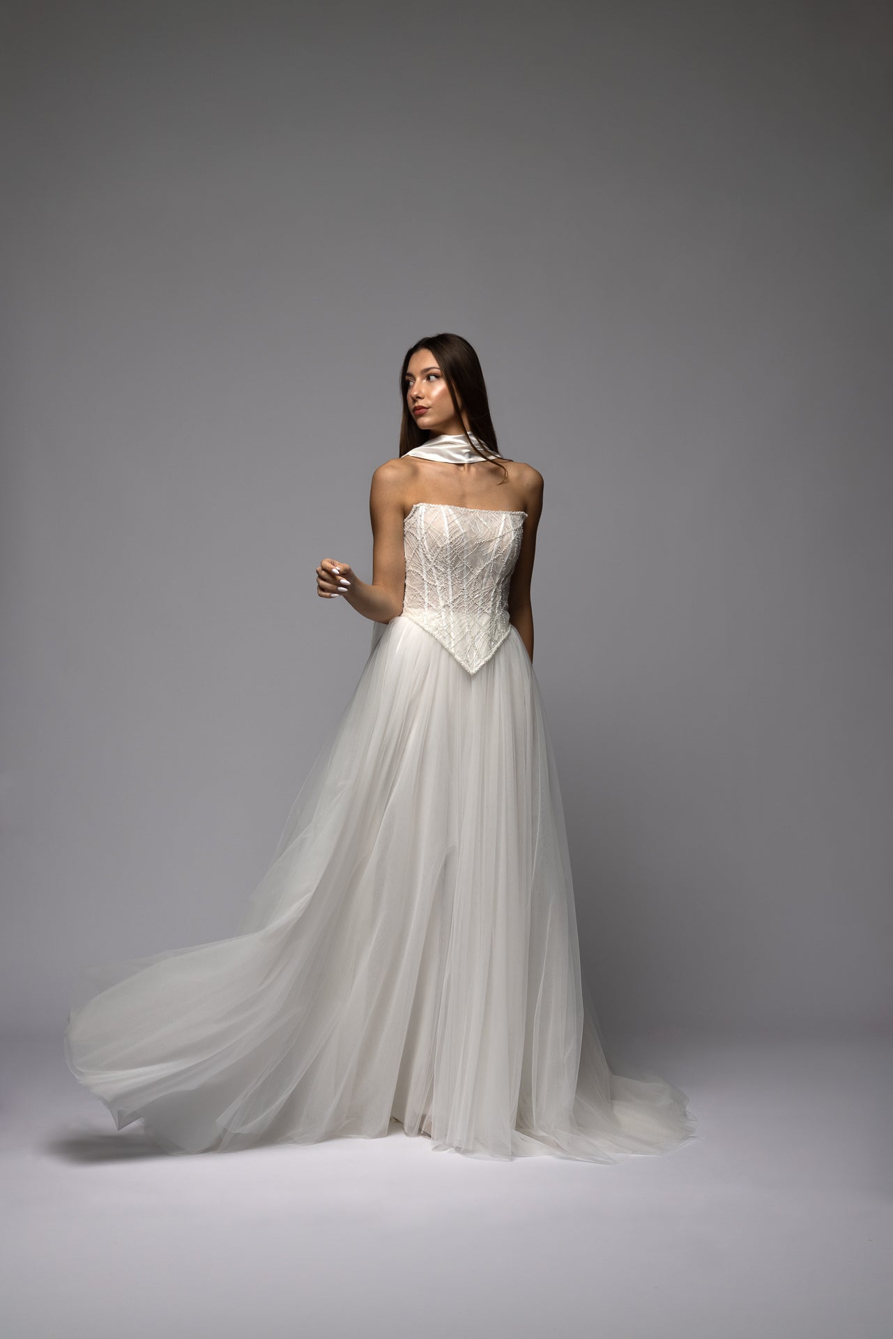 The tulle skirt is made from soft English flowing tulle. Light and airy, it creates natural volume and graceful movement.