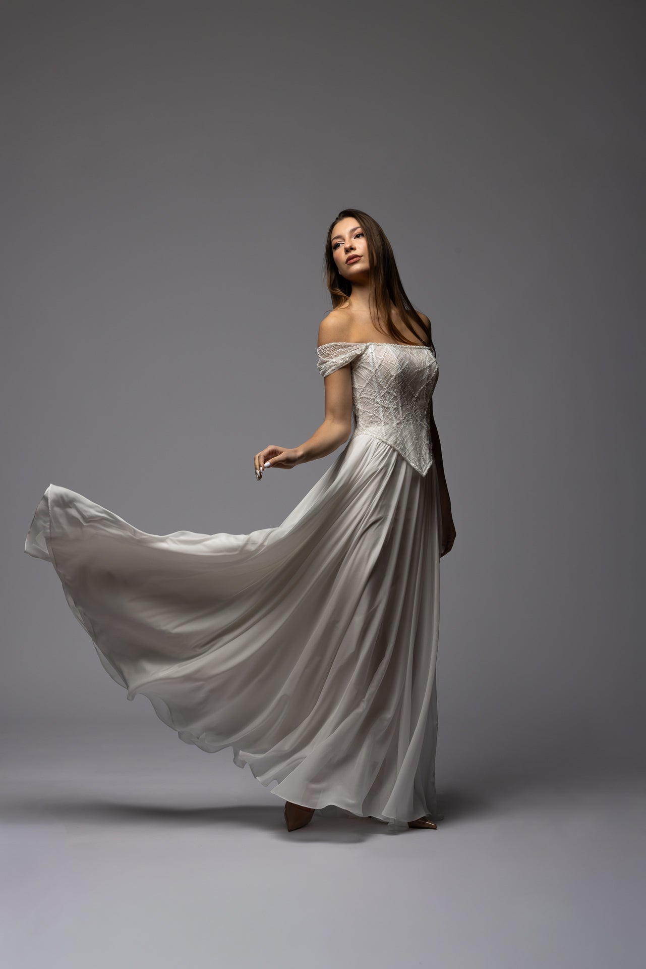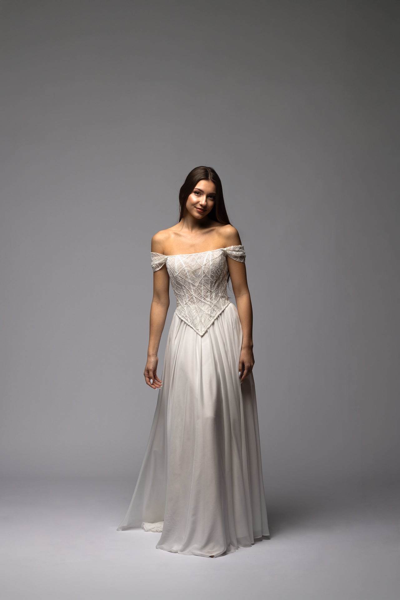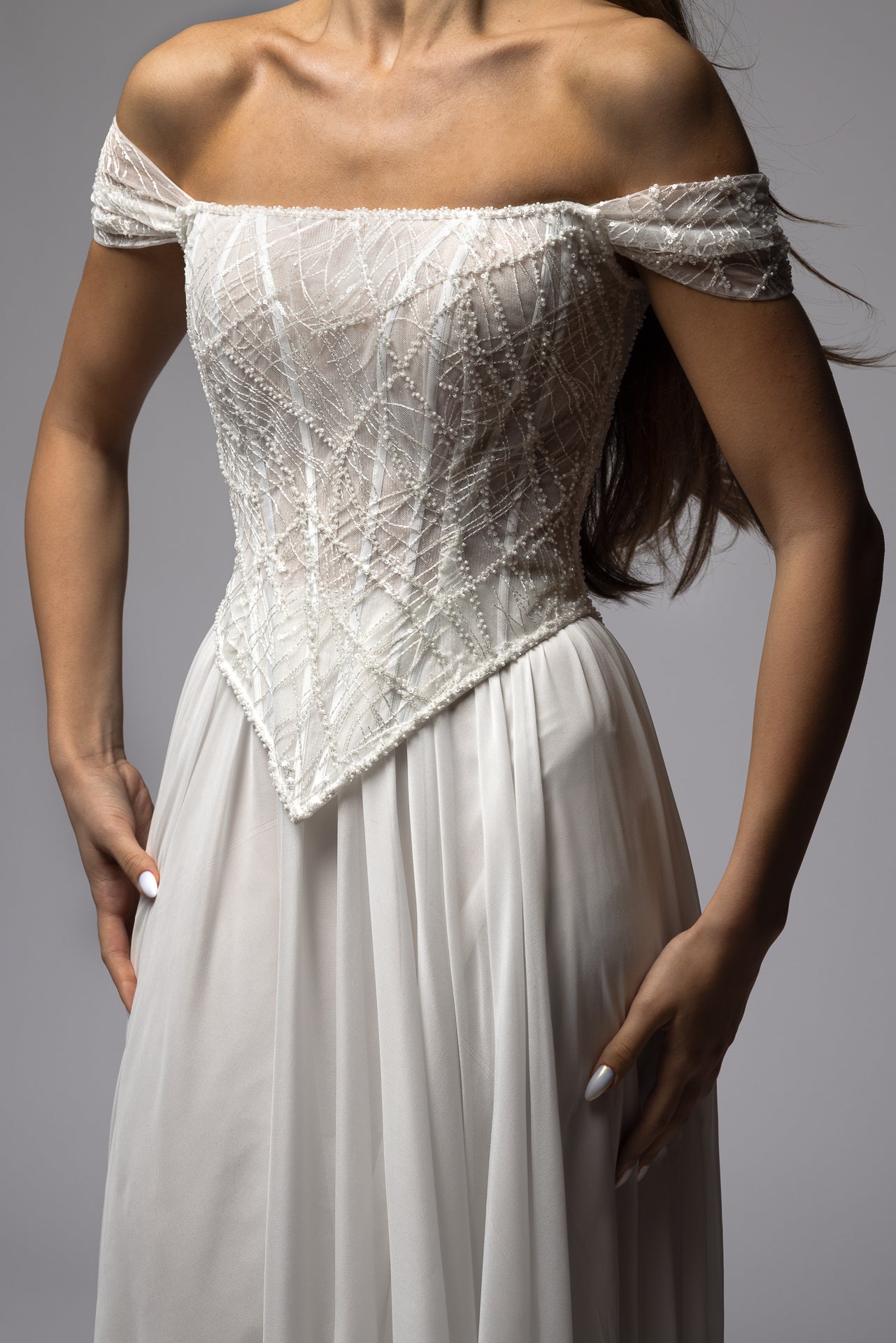 Beaded Off Shoulder Corset Chiffon Skirt A-line Wedding Dress Symphony