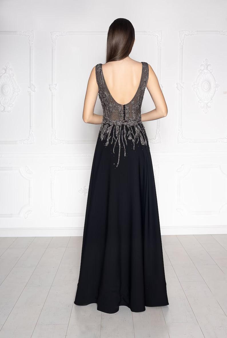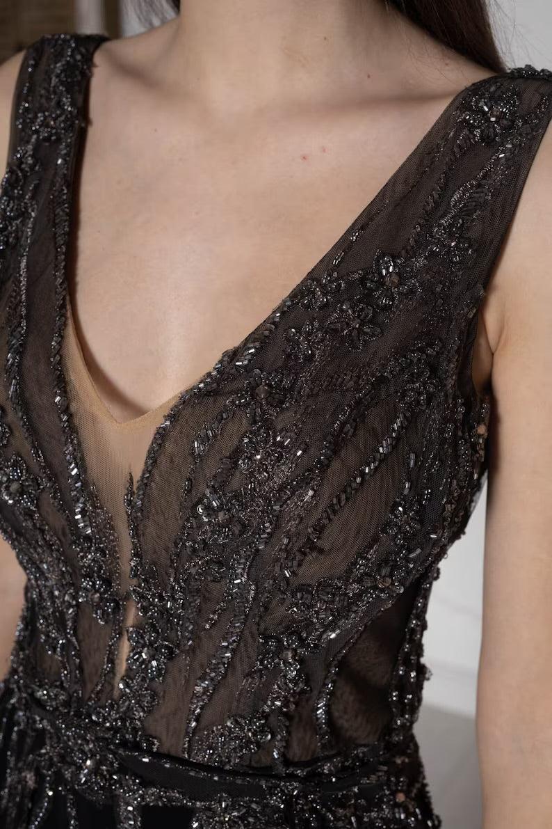 Elevate your bridal style with our exquisite black wedding dress featuring a stunning deep V-neckline crafted from georgette and mesh.