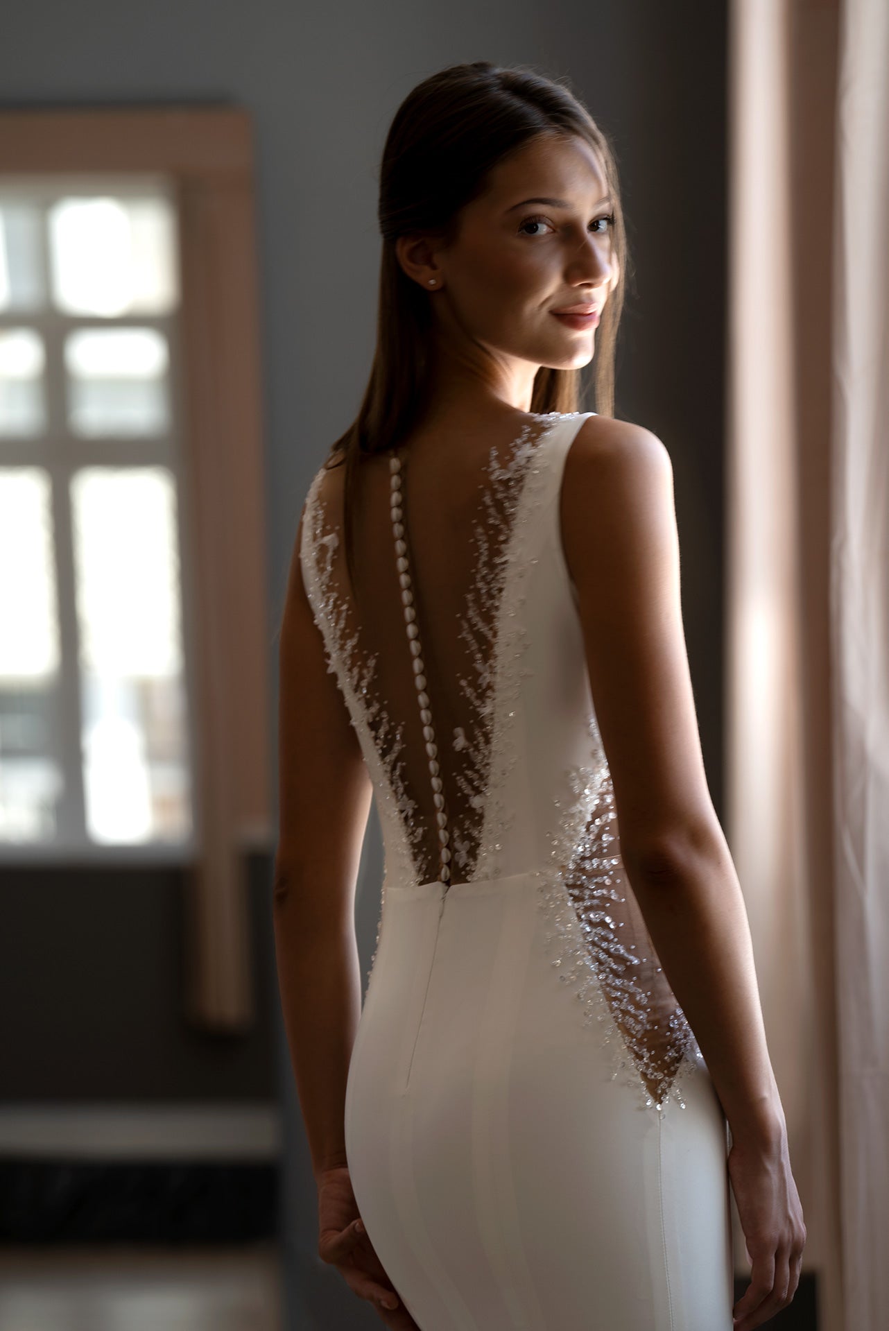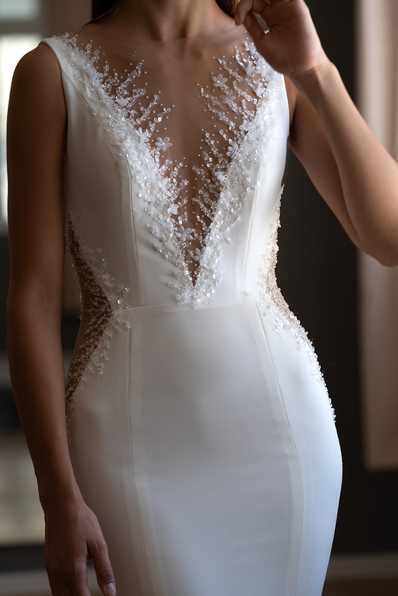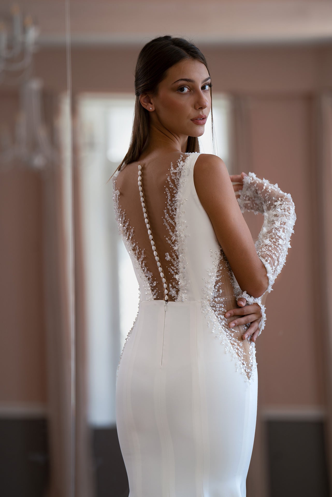 Sophisticated mermaid wedding gown crafted from smooth Italian crepe with soft illusion tulle accents. The structured bodice features hand-placed French lace, creating a subtle illusion effect that feels both modern and timeless. The mermaid silhouette highlights the figure with subtle structure, offering a graceful and contemporary shape. Every element is thoughtfully considered, from the soft textures to the hours of handwork behind each detail.