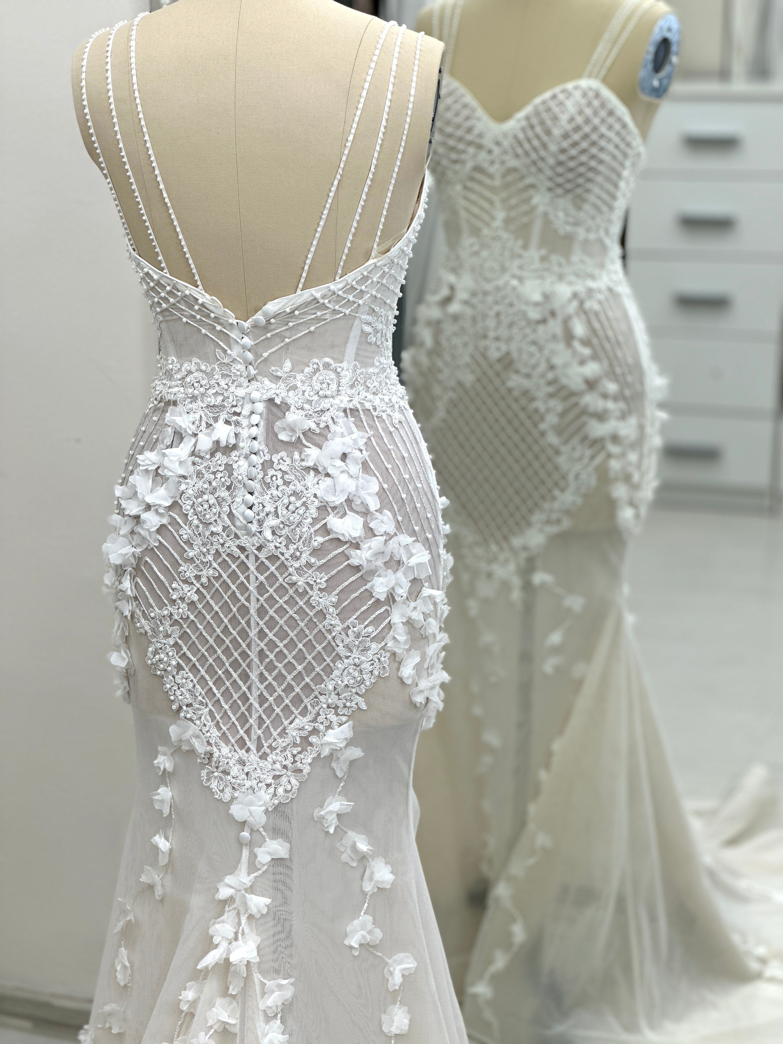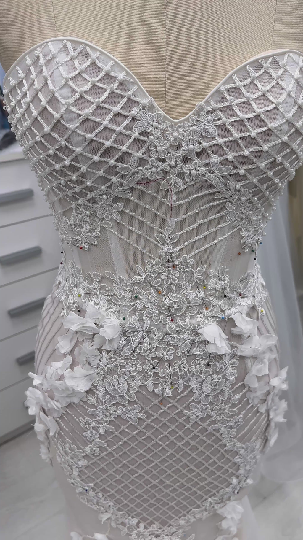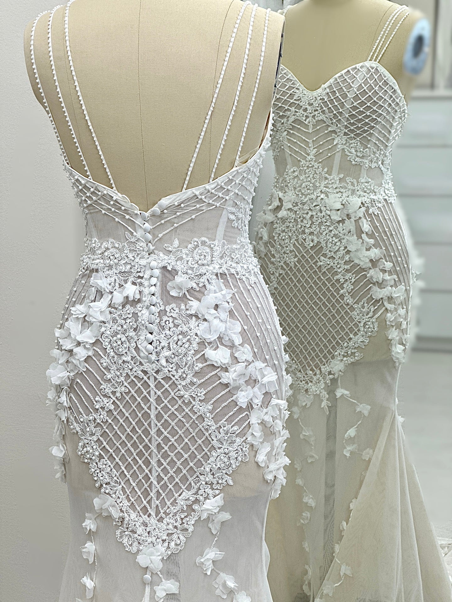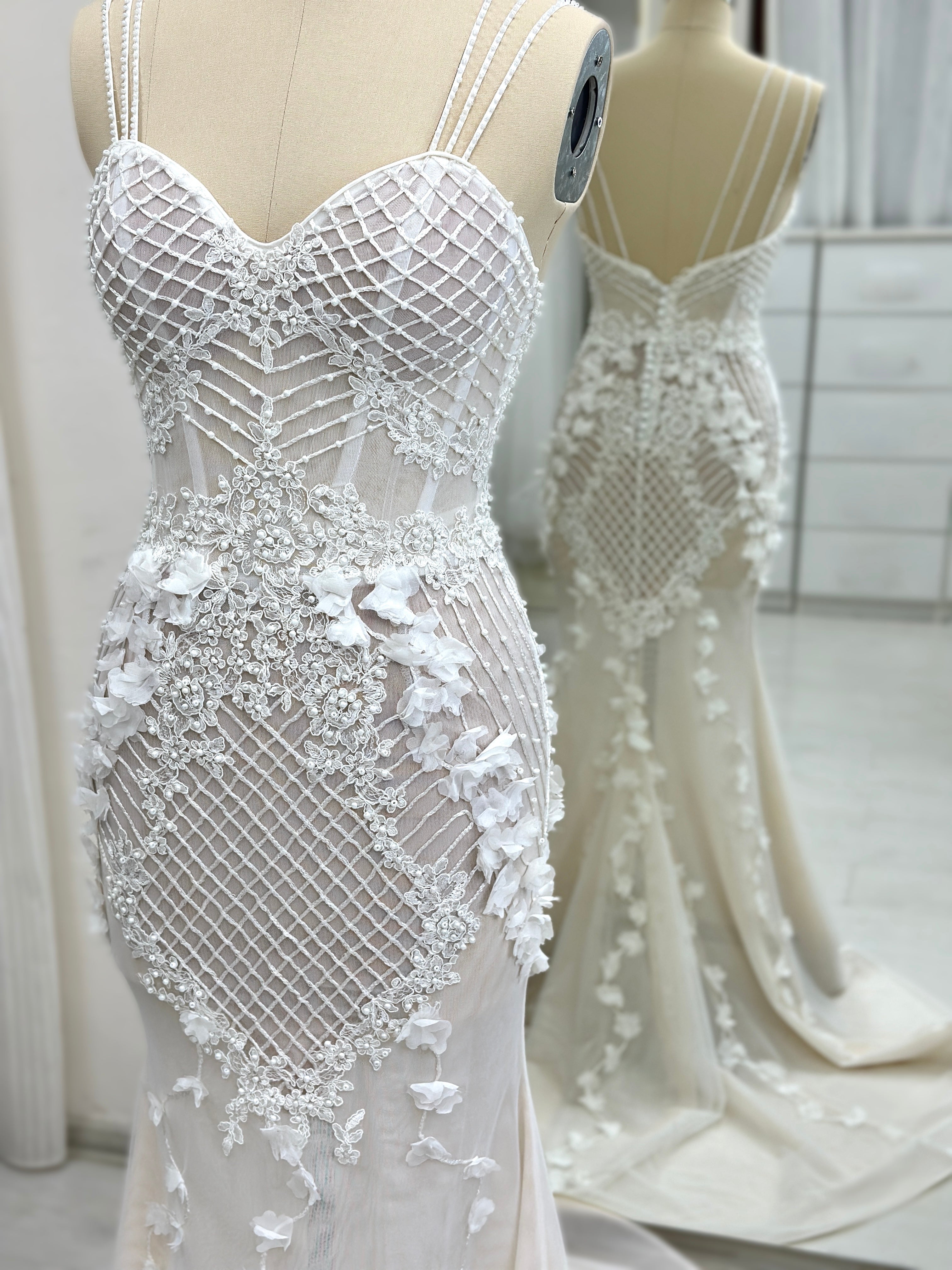 Elegant Lace Wedding Dress is a masterpiece of bridal couture, designed for brides who value timeless elegance and exquisite craftsmanship. Form-fitting gown combines intricate lacework, handmade 3D flowers, and delicate geometric line detailing, each element thoughtfully arranged to create a captivating, romantic look. Every geometric line is meticulously hand-sewn with fine silk thread, showcasing hours of skilled craftsmanship and artistry.