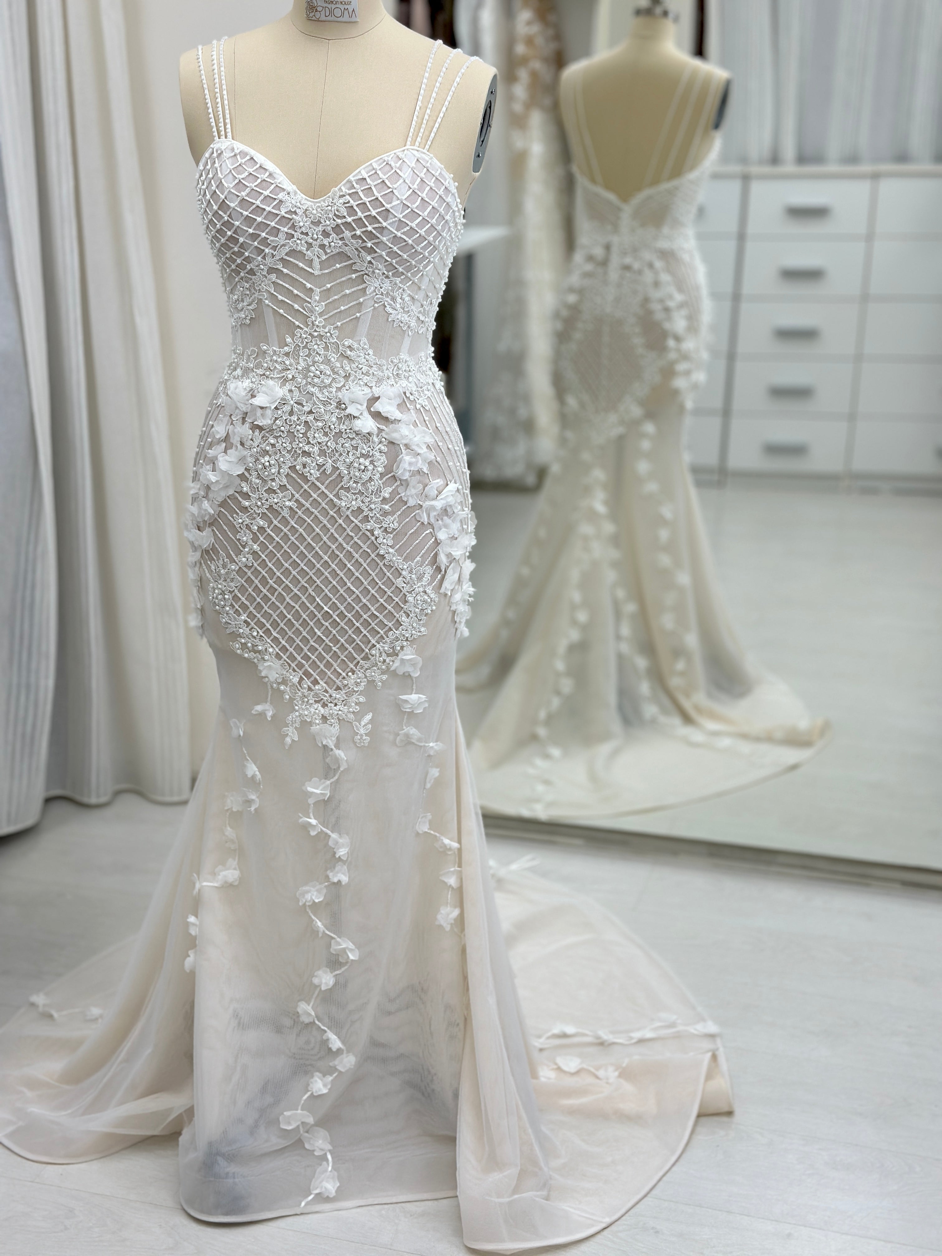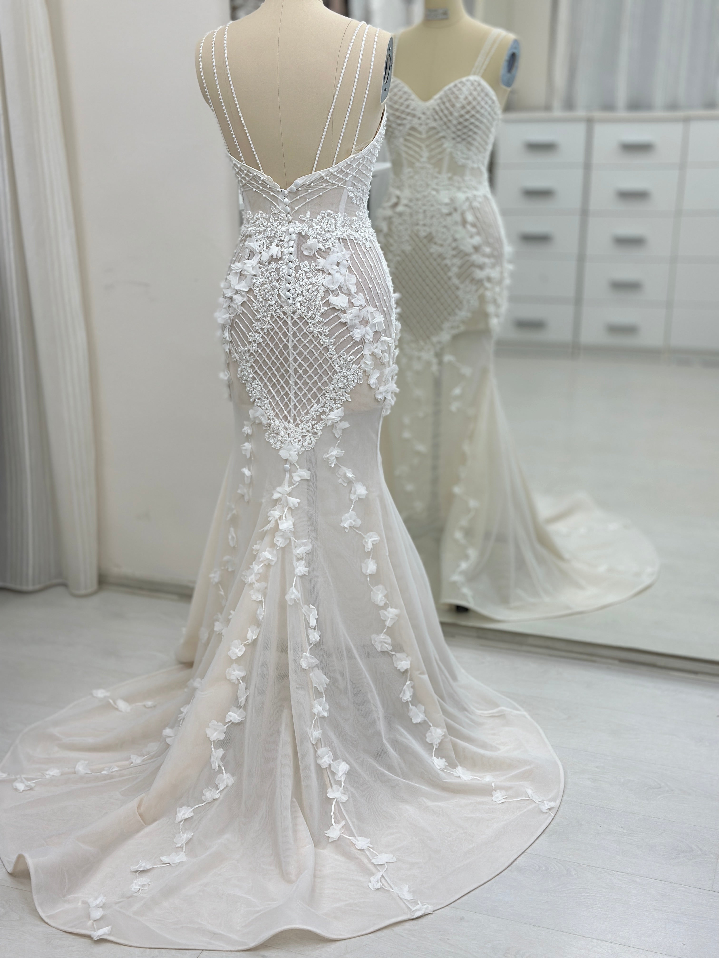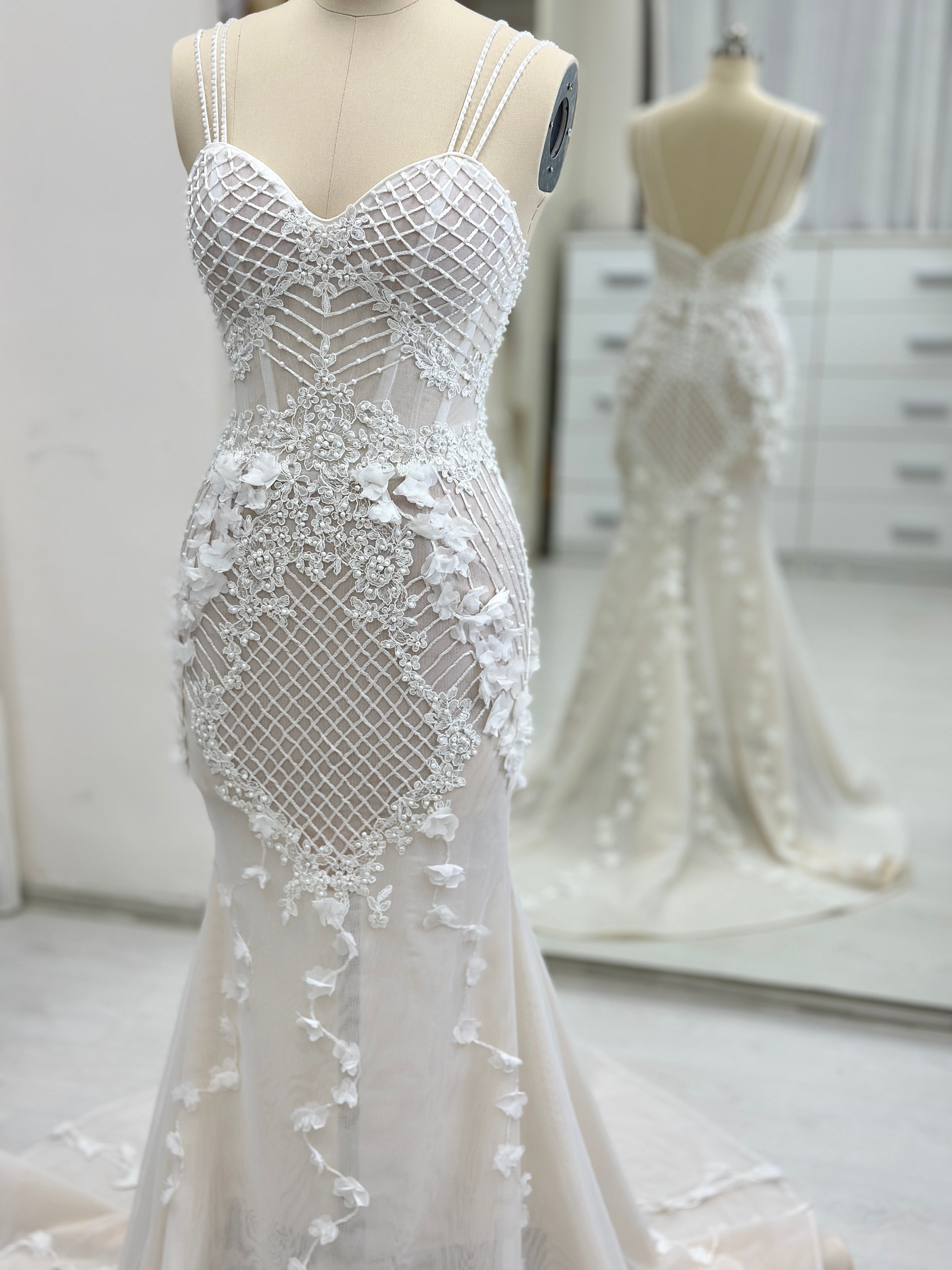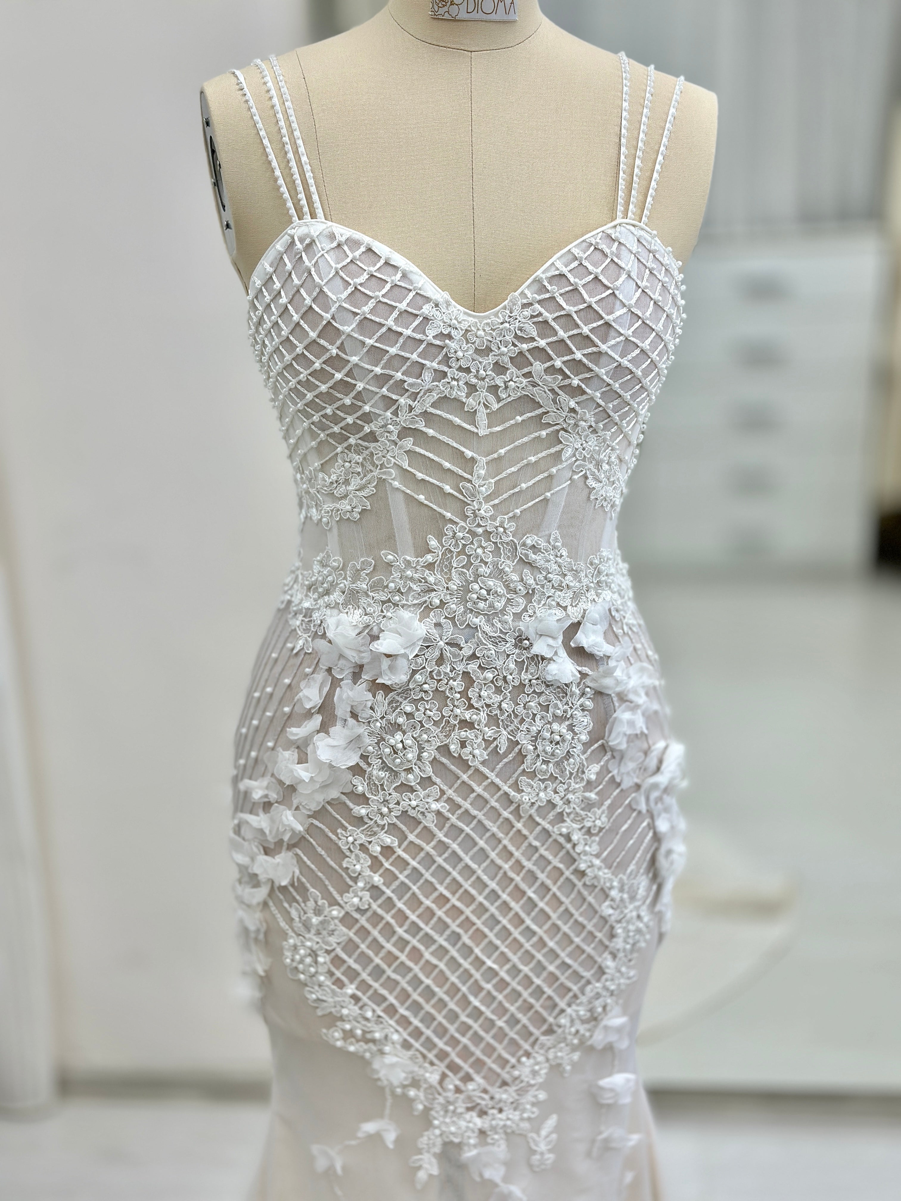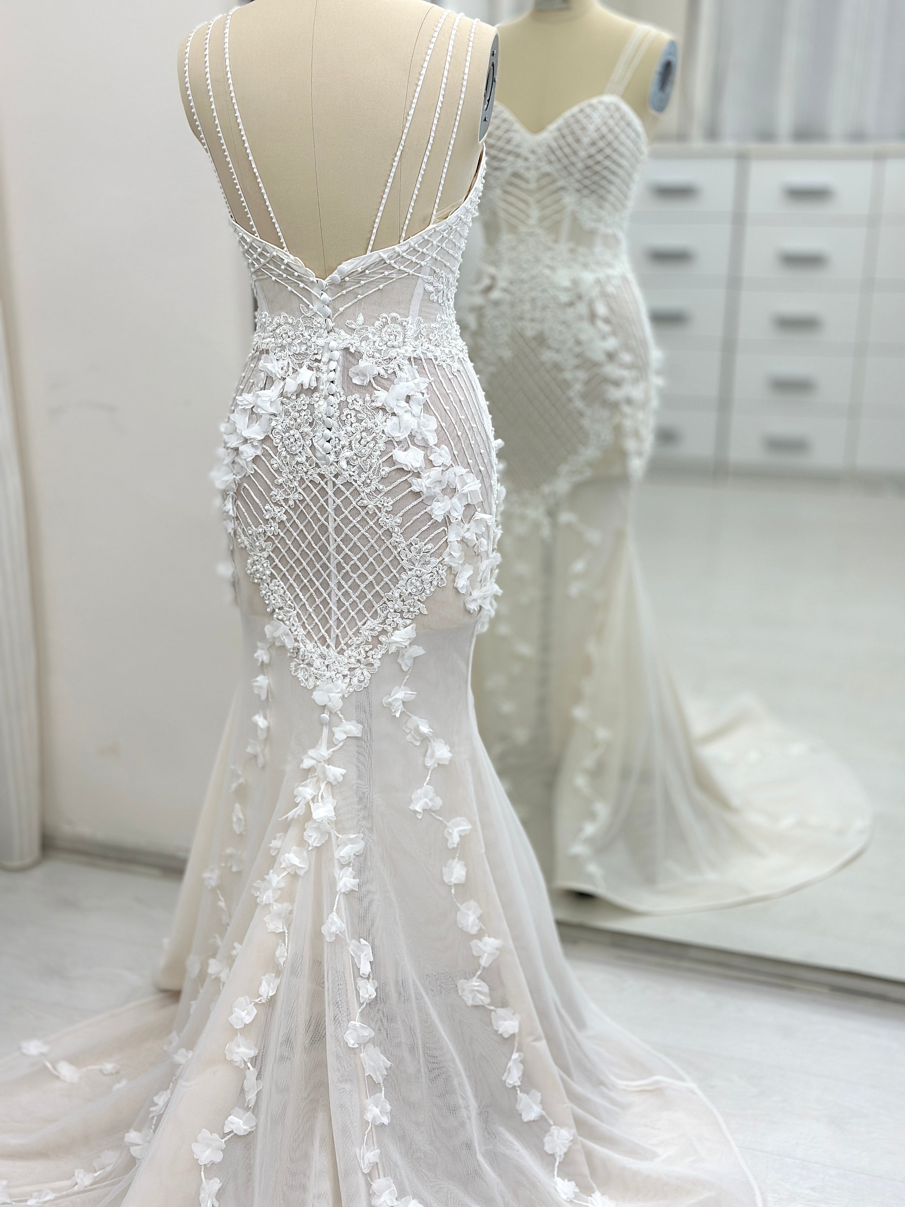 Elegant Lace Wedding Dress is a masterpiece of bridal couture, designed for brides who value timeless elegance and exquisite craftsmanship. Form-fitting gown combines intricate lacework, handmade 3D flowers, and delicate geometric line detailing, each element thoughtfully arranged to create a captivating, romantic look. Every geometric line is meticulously hand-sewn with fine silk thread, showcasing hours of skilled craftsmanship and artistry.