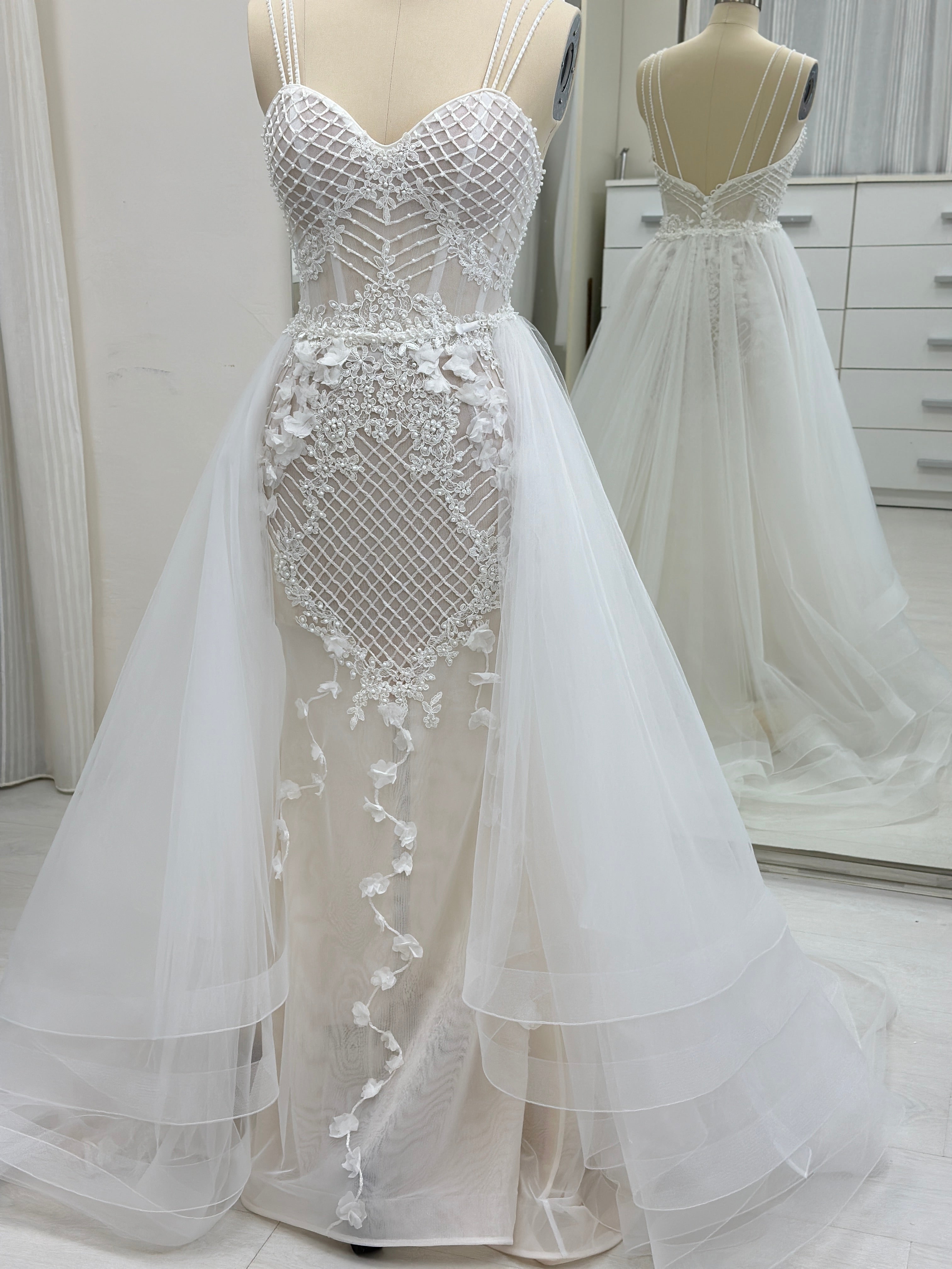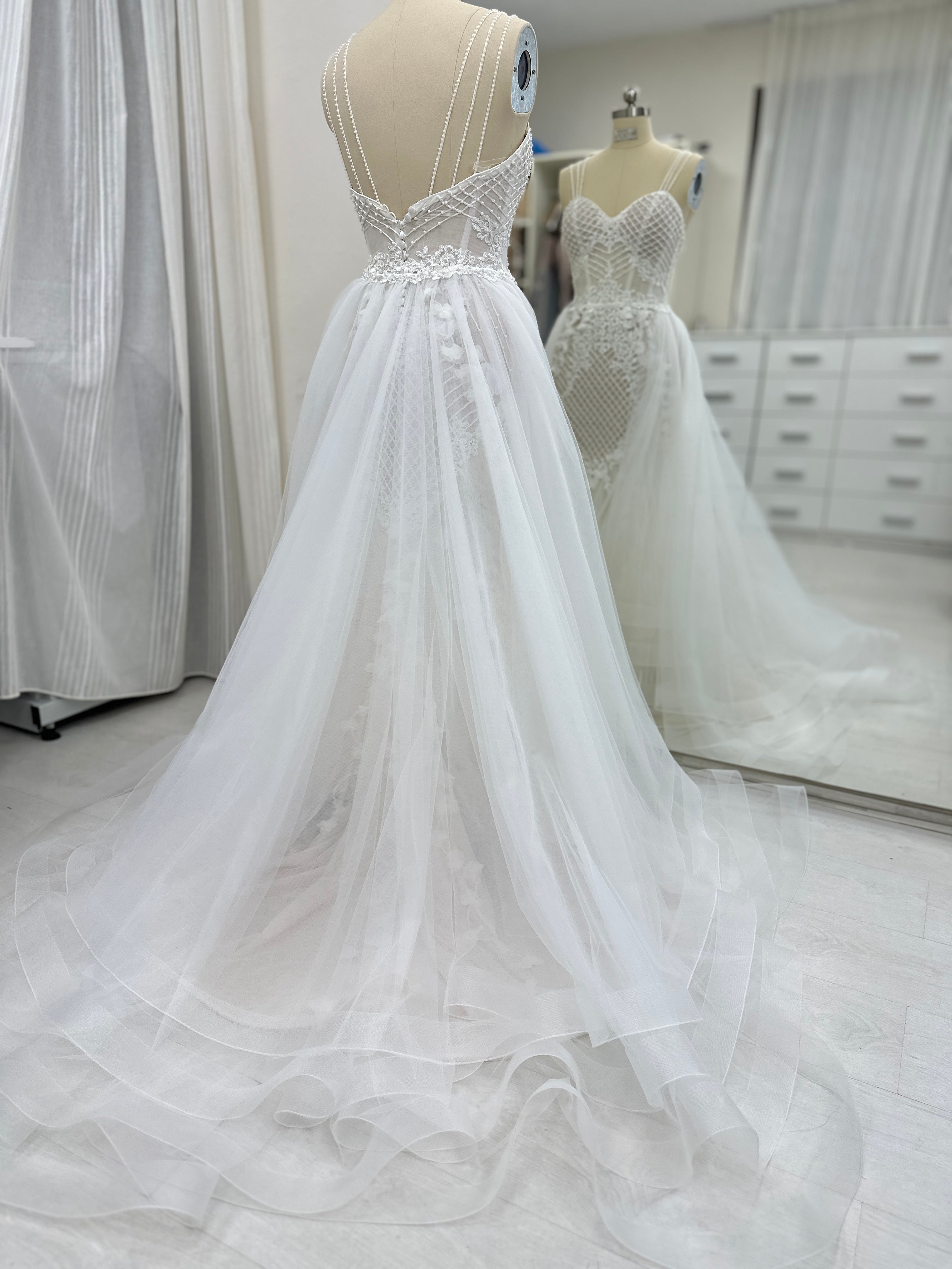 Elegant gown also features a detachable tulle train, adding versatility and drama to the look. This removable overlay attaches seamlessly, creating a flowing, ethereal effect that can be worn for the ceremony and removed for a sleek, sophisticated reception style.