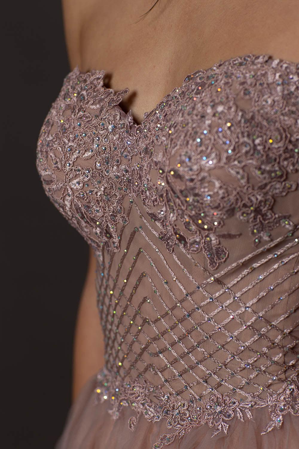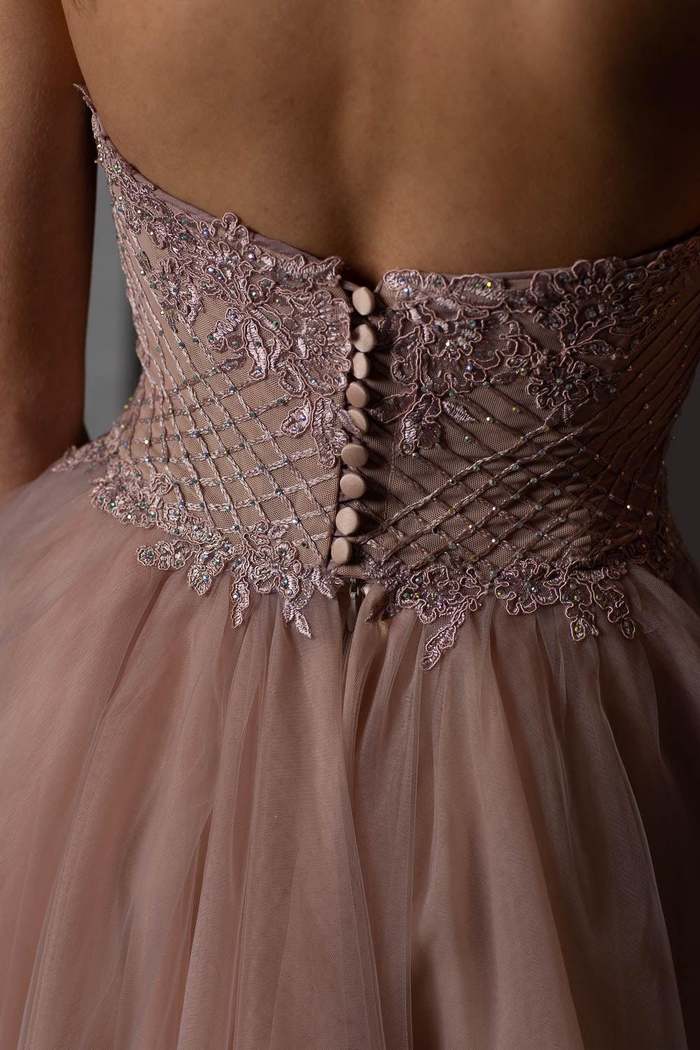 Crafted with meticulous attention to detail, our pink gown is adorned with a row of exquisite hand-made buttons that elegantly close at the back. The bodice is a masterpiece, featuring meticulously hand-cut lace floral ornaments and glistening Swarovski crystals, creating a captivating and sensuous visual impact while accentuating the feminine silhouette. The skirt is a dreamy composition of delicate blush pink tulle.
