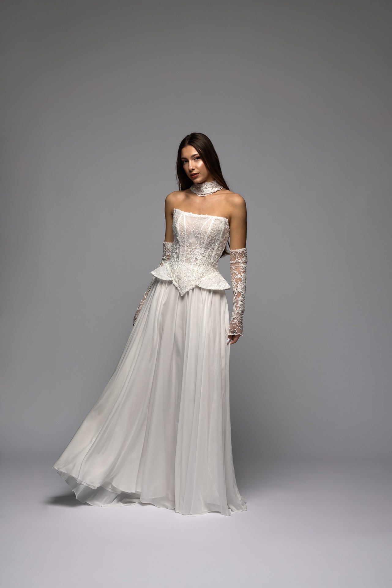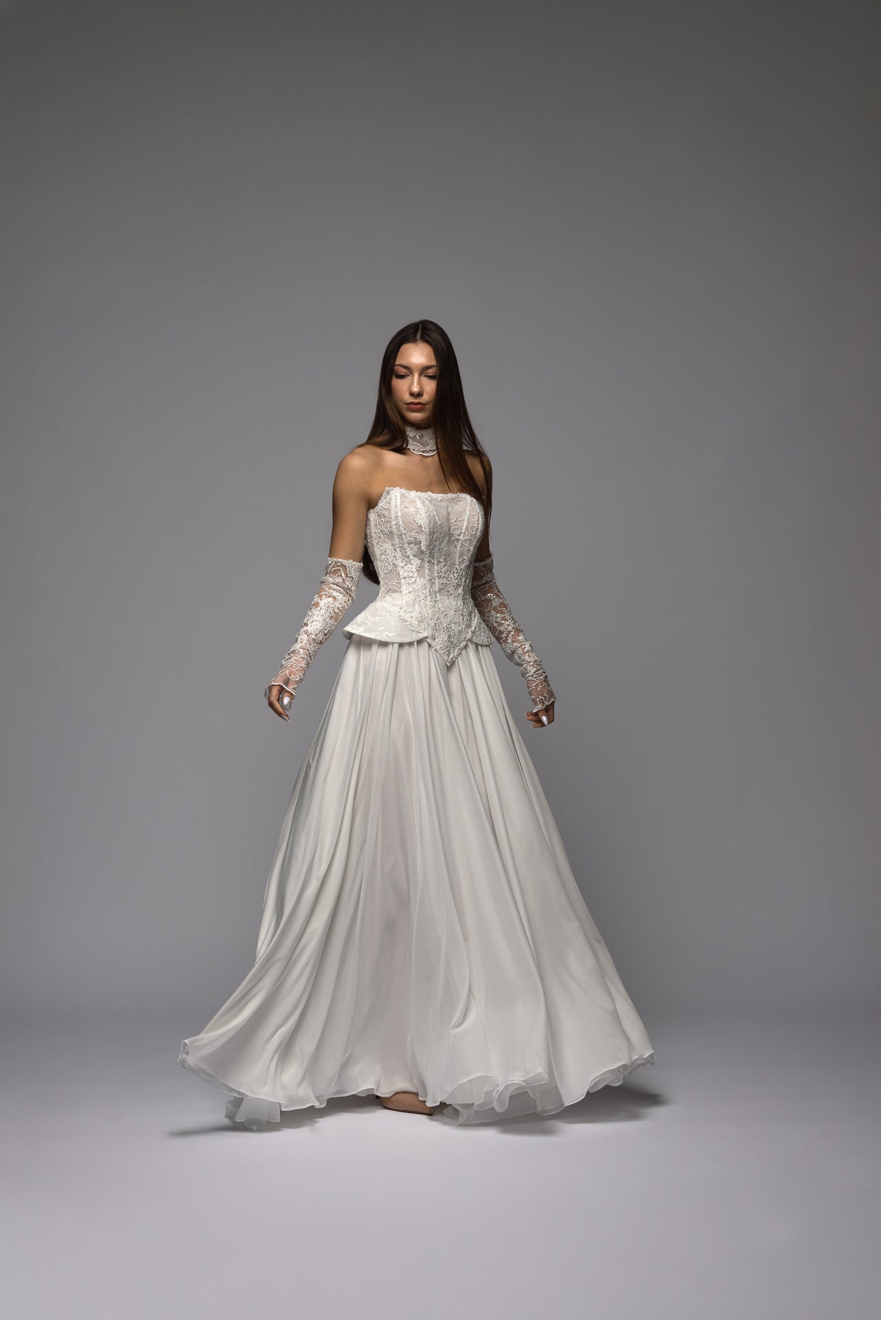 Paired with a lightweight chiffon skirt that flows softly with movement. The airy fabric creates a gentle, romantic silhouette and adds contrast to the structured lace bodice.