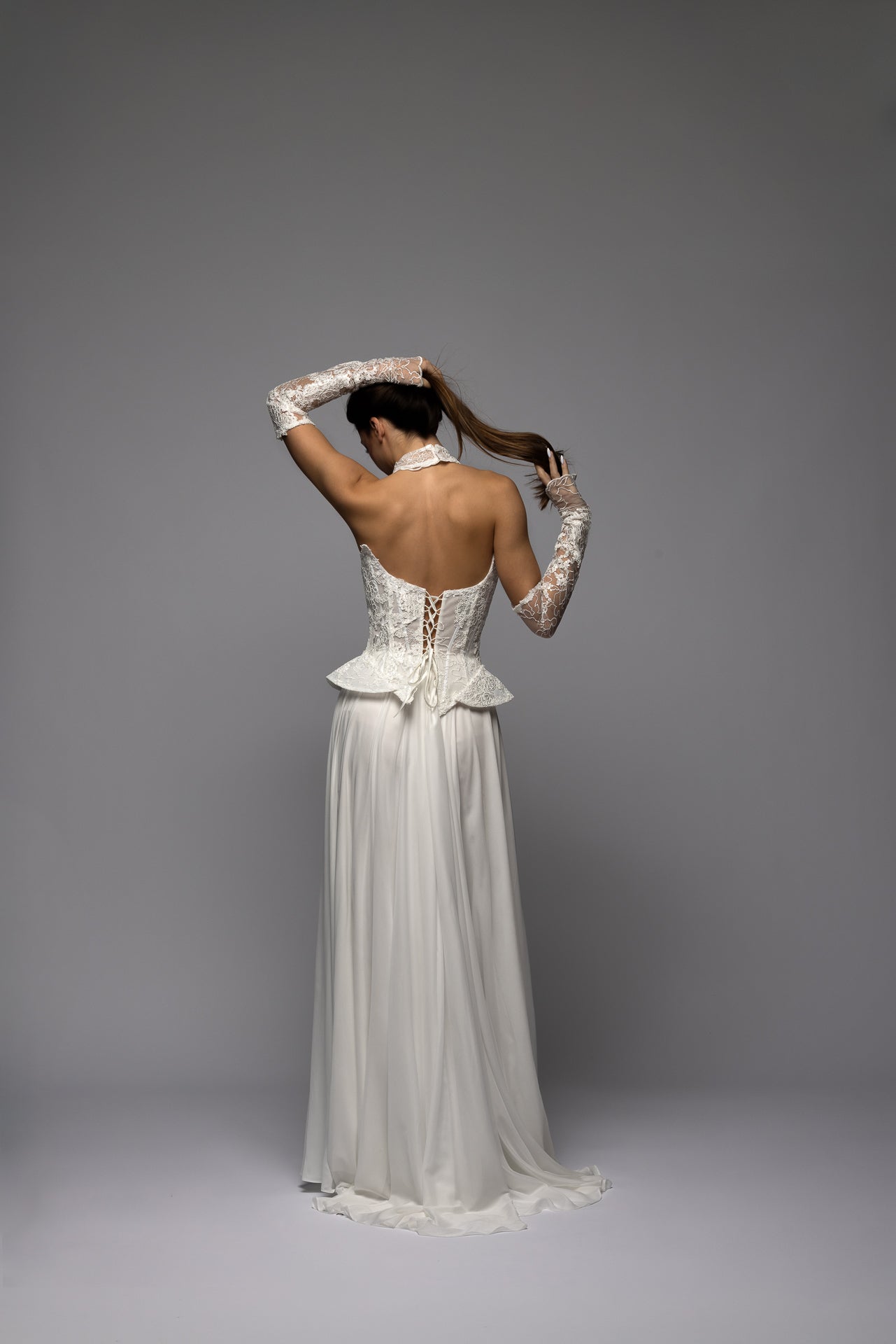 LYRE is designed for brides who love a balance of structure and softness, combining detailed lace with effortless movement.