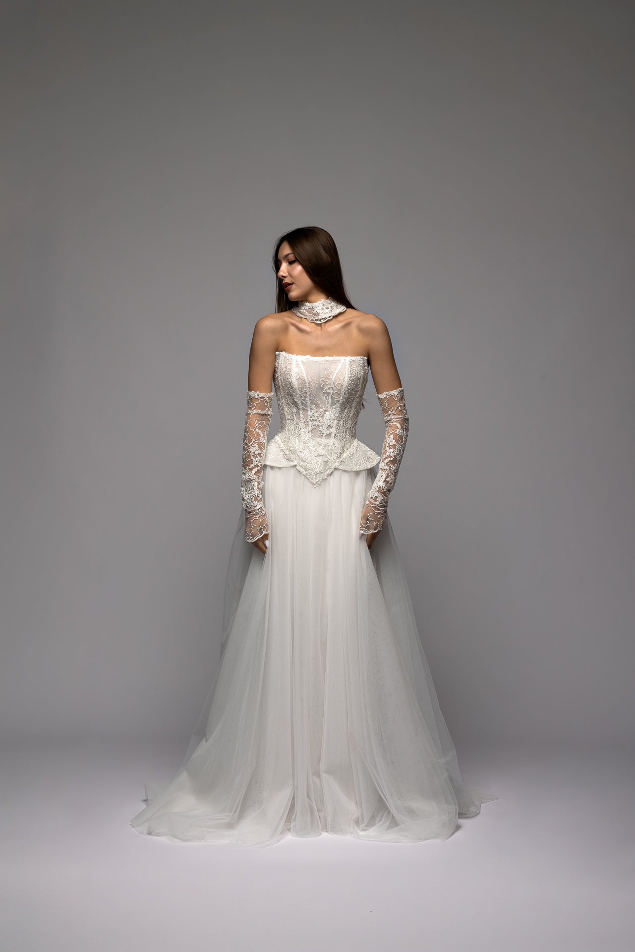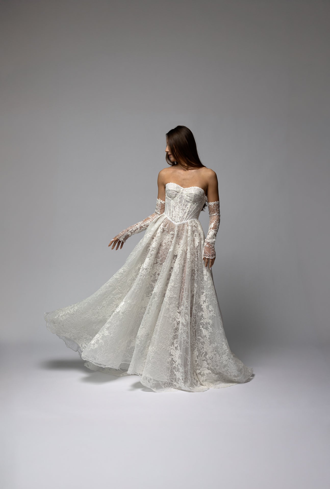 Elevate your bridal ensemble with the Sonata long lace gloves, a timeless accessory that brings refined elegance to your wedding day.