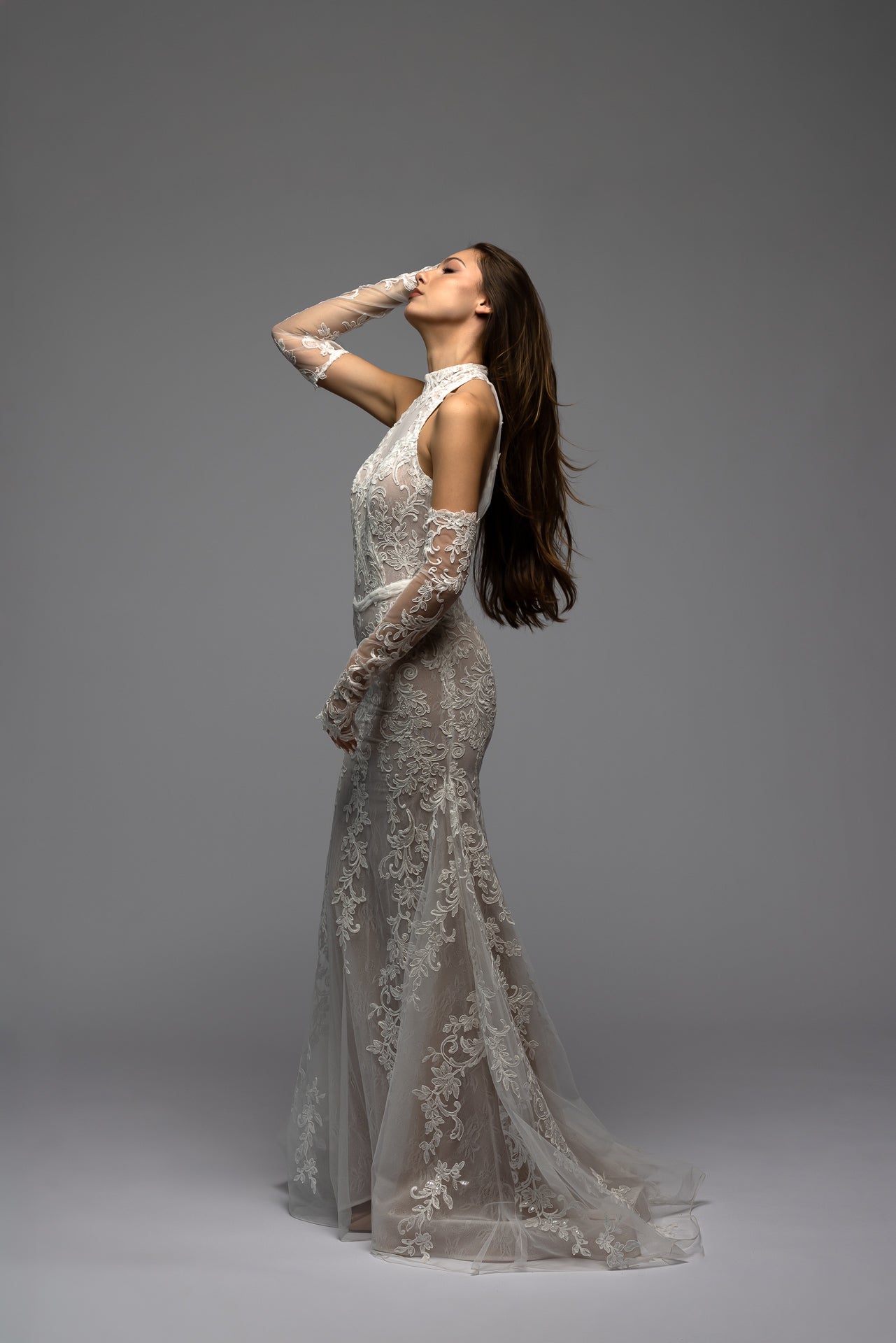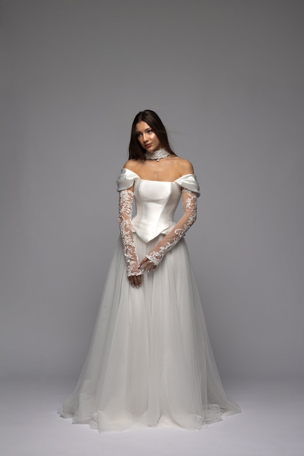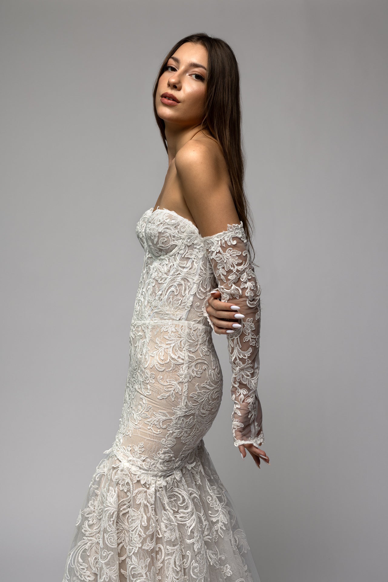 Elevate your bridal ensemble with the Viola long lace gloves, a timeless accessory that brings refined elegance to your wedding day.