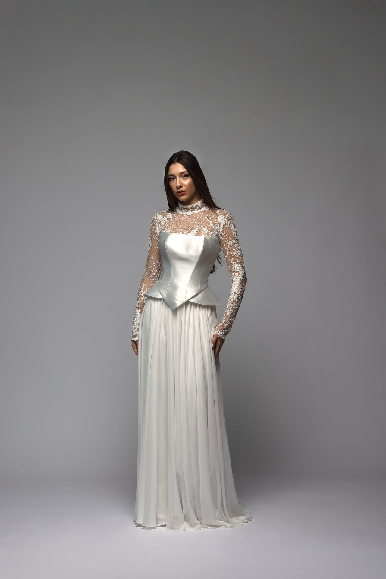 This minimalist romantic A-line wedding dress is designed as a two-piece set, combining a structured Mikado corset with a flowing chiffon skirt. Basque waist corset features a straight neckline. Structured boning shapes and supports the waist, while the lace-up back ensures an adjustable, secure fit.
