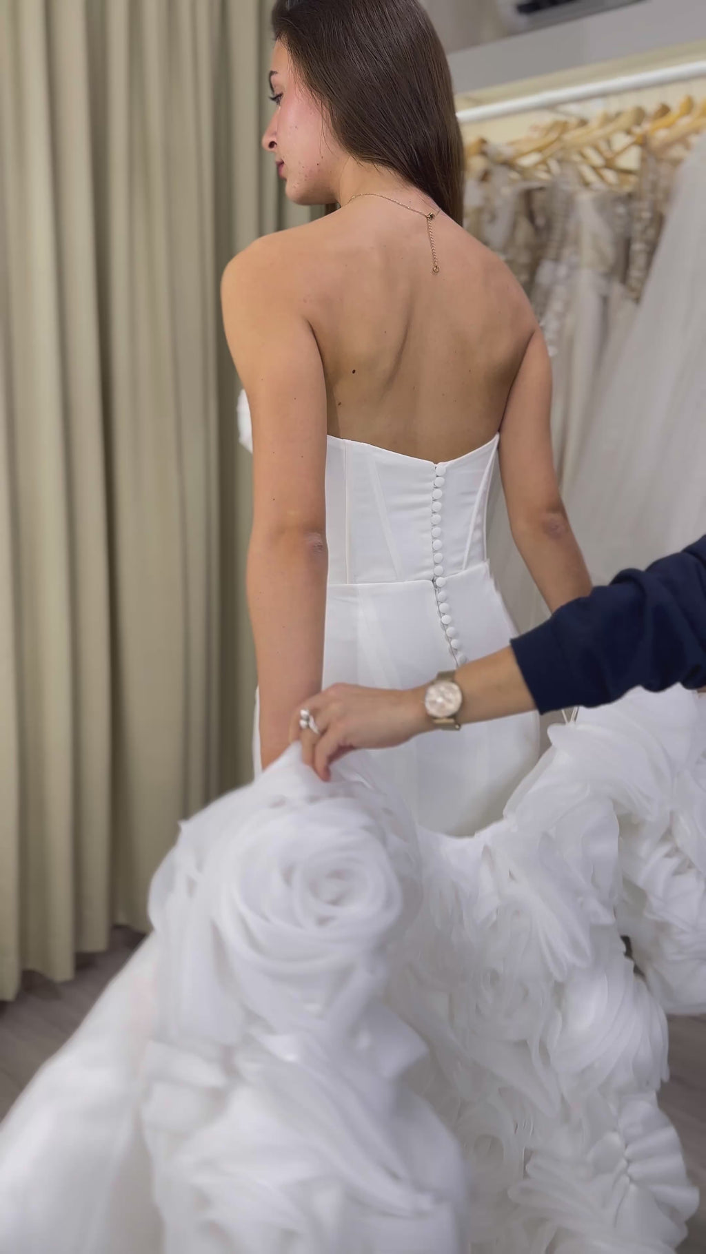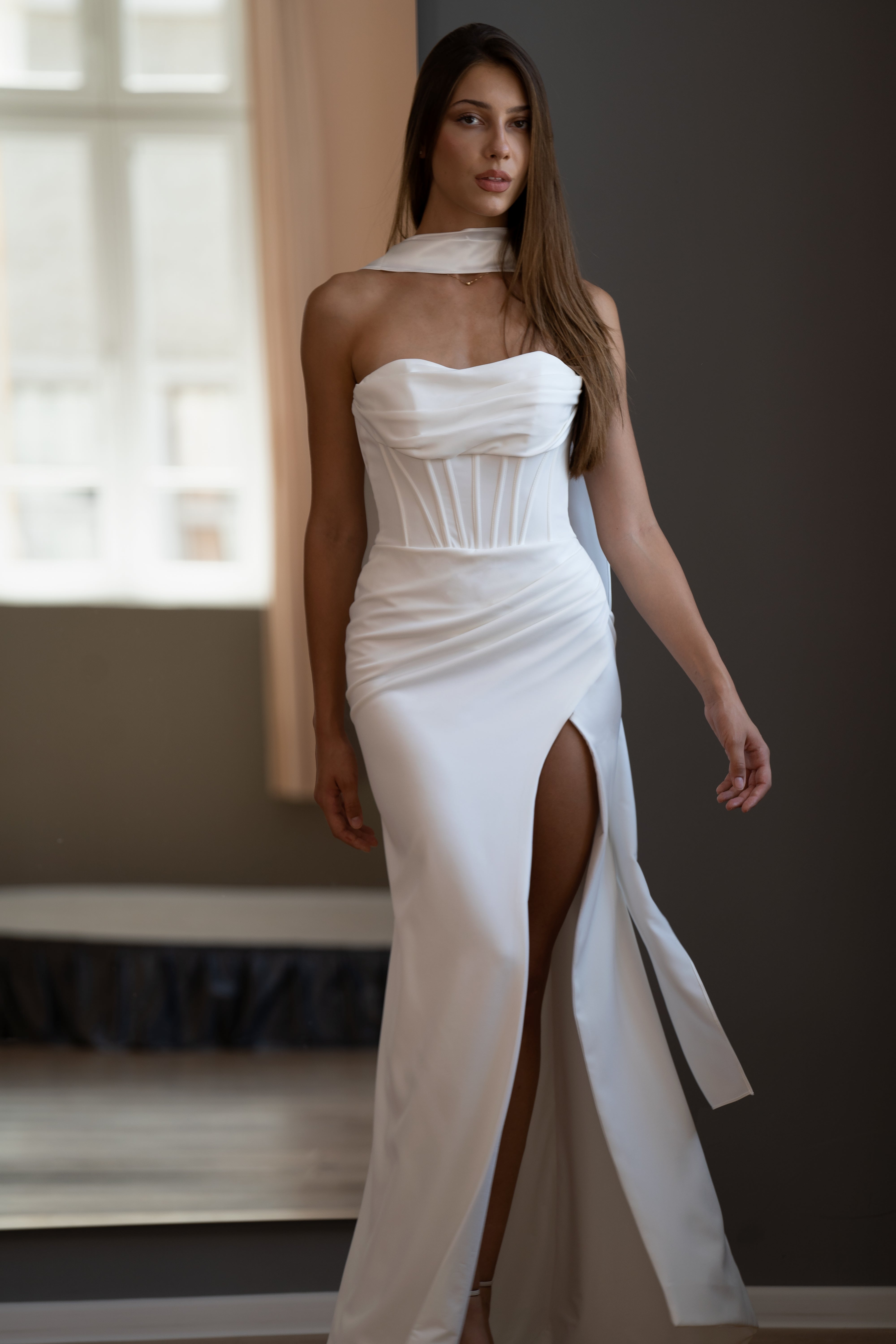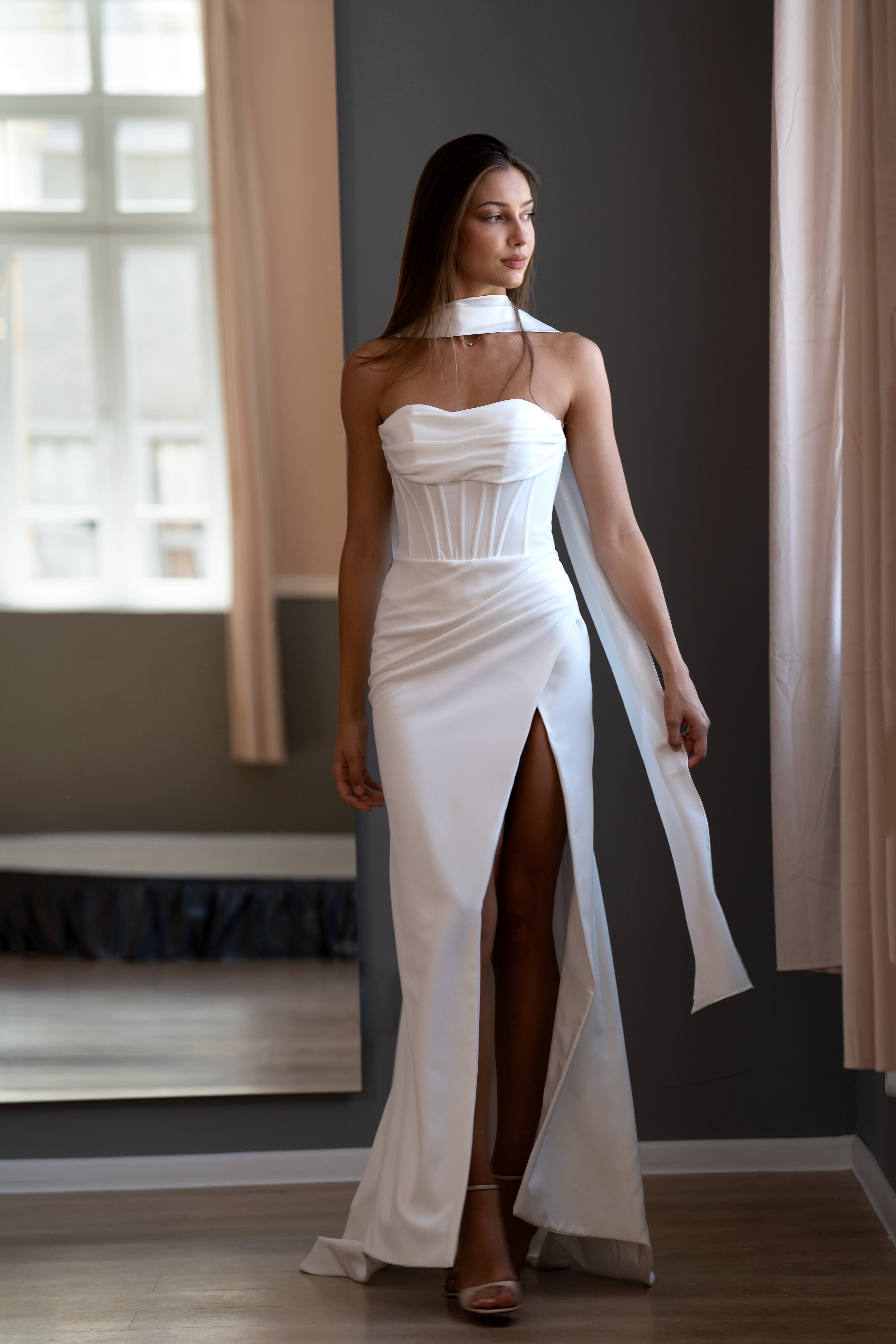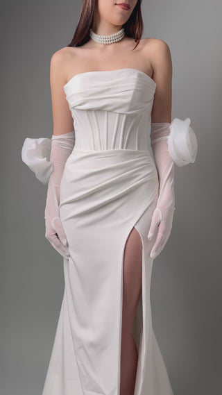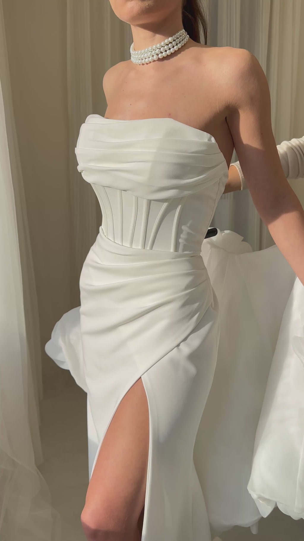 Minimalist Strapless Fit & Flare Crepe Wedding Dress combines timeless elegance with contemporary allure. Crafted from luxurious Italian crepe, the gown features a sleek mermaid silhouette that accentuates the body’s natural curves while flaring gently at the knees for a graceful finish. A high slit adds a dramatic touch, creating a perfect blend of sophistication and modern edge. The gown’s subtle draped details enhance its fluidity and texture, offering understated glamour.