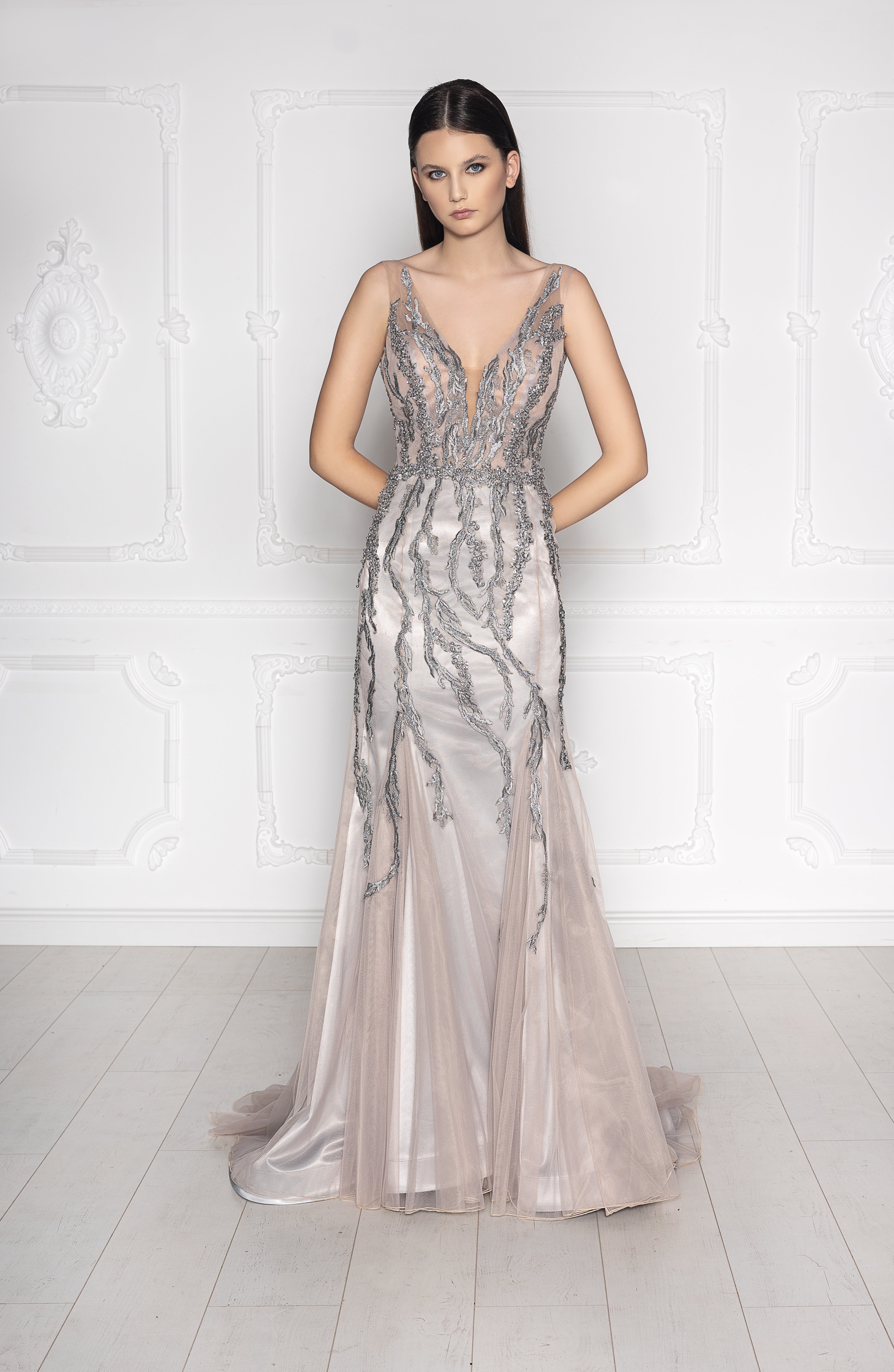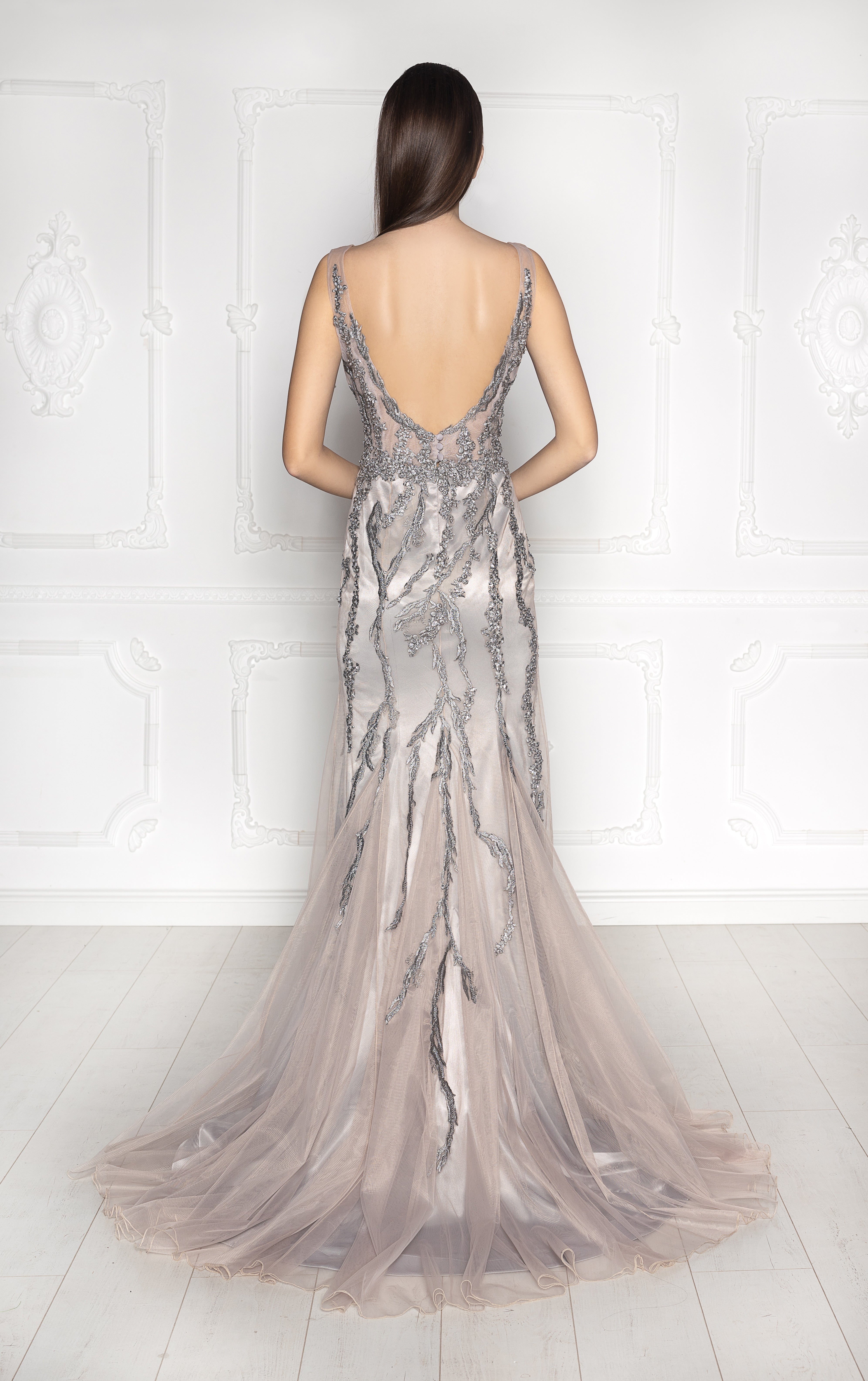 Make an unforgettable entrance in this Silver V-neck beaded evening gown. Designed with a plunging V-neckline and a daring low back, this sleeveless gown showcases exquisite beadwork and embroidered lace that trails gracefully down a mermaid silhouette. Each lace detail is carefully hand-cut and hand-embroidered to the dress. Featuring a satin lining with tulle on top, which flows into a soft train, adding drama and elegance to every step.