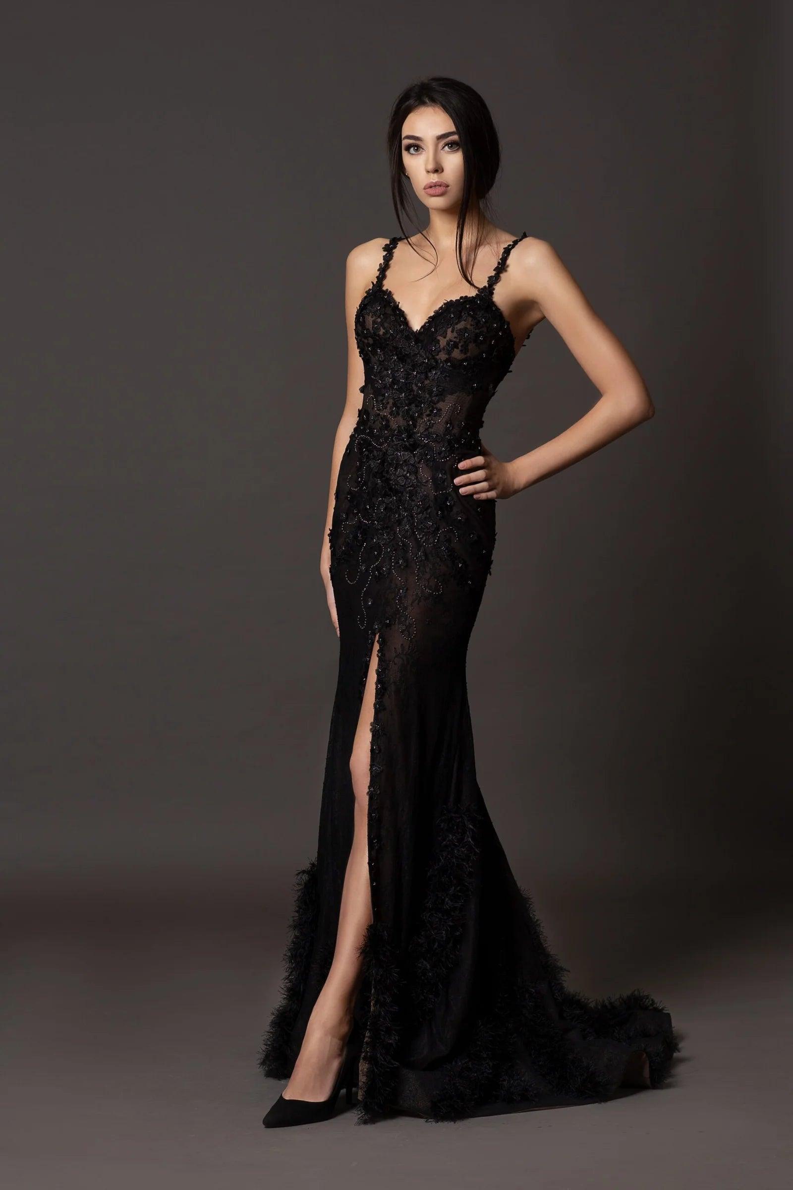 Crafted from black mesh and adorned with delicate lace, this elegant formal gown showcases a Sheath silhouette that reflects countless hours of meticulous handwork. Every intricate detail, from the lace to the pearls, is meticulously sewn by hand, creating a true work of art. The gown boasts a seductive open back, alluring straps, and a graceful train adorned with feather accents, ensuring a show-stopping and unforgettable presence.