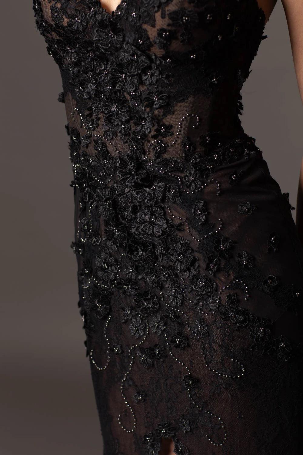 Exquisite Black Formal Gown: Intricately Crafted with Lace, Pearls, and Feathers. Crafted from black mesh and adorned with delicate lace, this elegant formal gown showcases a Sheath silhouette that reflects countless hours of meticulous handwork.